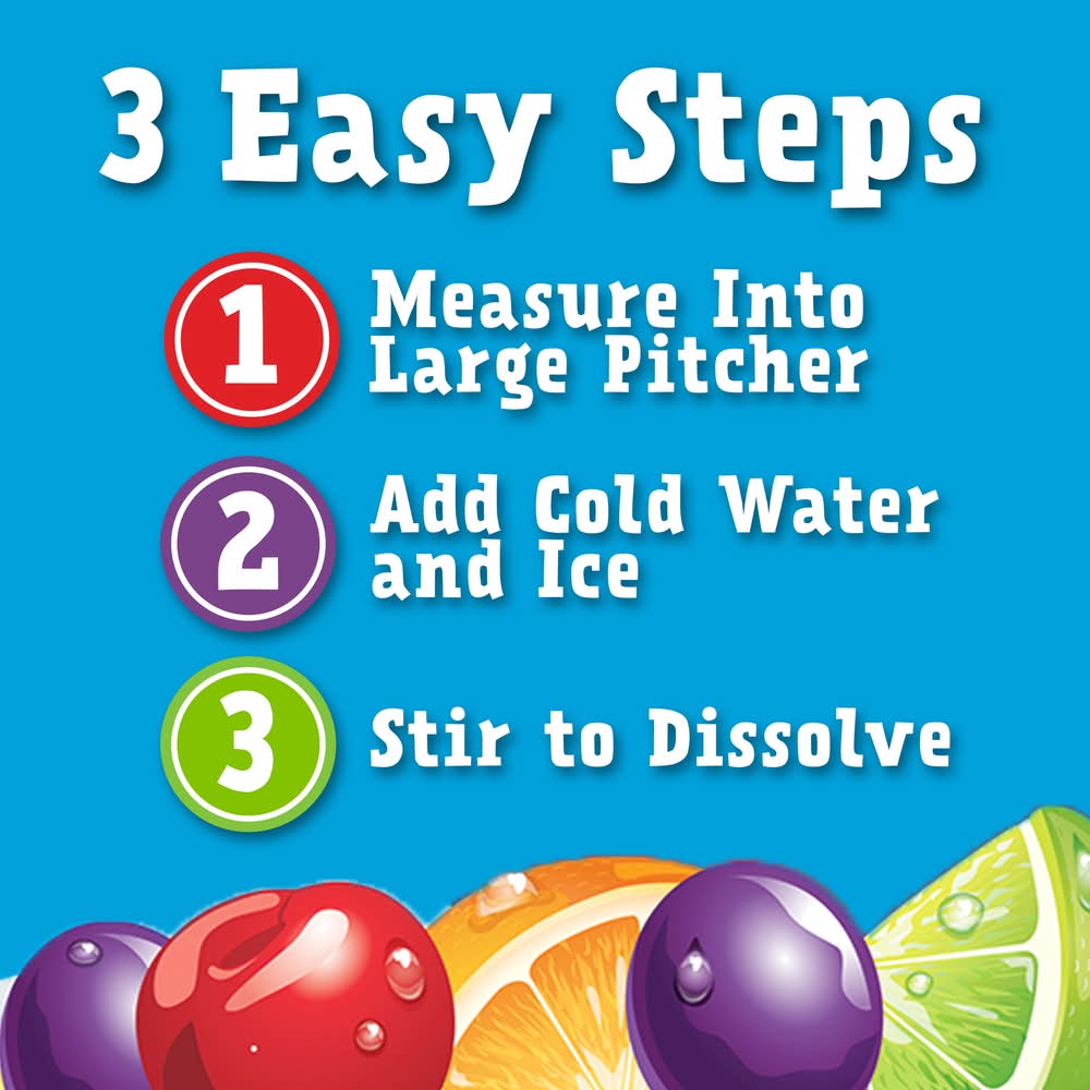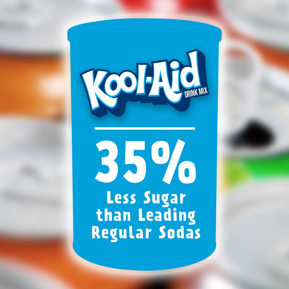 Kool-Aid Artificially Flavored Tropical Punch Powdered Drink Mix is a refreshing and delicious drink powder that is perfect for any occasion. Our drink mix is specially formulated to provide a taste of the tropics in every sip, with a sweet and fruity flavor that is sure to please. Simply mix the powder with water and stir until it is fully dissolved. The resulting beverage is a vibrant red color that is sure to catch the eye and get your taste buds tingling. Our drink mix is perfect for parties, picnics or anytime you need a refreshing and tasty beverage. Kool-Aid Artificially Flavored Tropical Punch Powdered Drink Mix is a delicious way to stay hydrated. Kool-Aid powdered drink mix makes it easy to prepare a tasty tropical punch juice drink anywhere, just by mixing it with water. Quench your thirst with the refreshingly sweet taste of Kool-Aid. With 35% less sugar than leading regular sodas and no caffeine, Kool-Aid Artificially Flavored Tropical Punch Drink Mix is always a great choice for the whole family (this product 25 grams sugar; leading regular sodas 40 grams sugar per 12 fluid ounce serving). It's also a good source of Vitamin C. Each handy canister of powdered Kool-Aid Tropical Punch Mix ensures that you always have a refreshing beverage ready-to-go. Enjoy revitalizing Kool-Aid powder at work or at home, or mix drink powder in a bottle of water to take on-the-go. Our 82.5-ounce canister of powdered drink mix is resealable to help lock in flavor. Packaging: Reusable