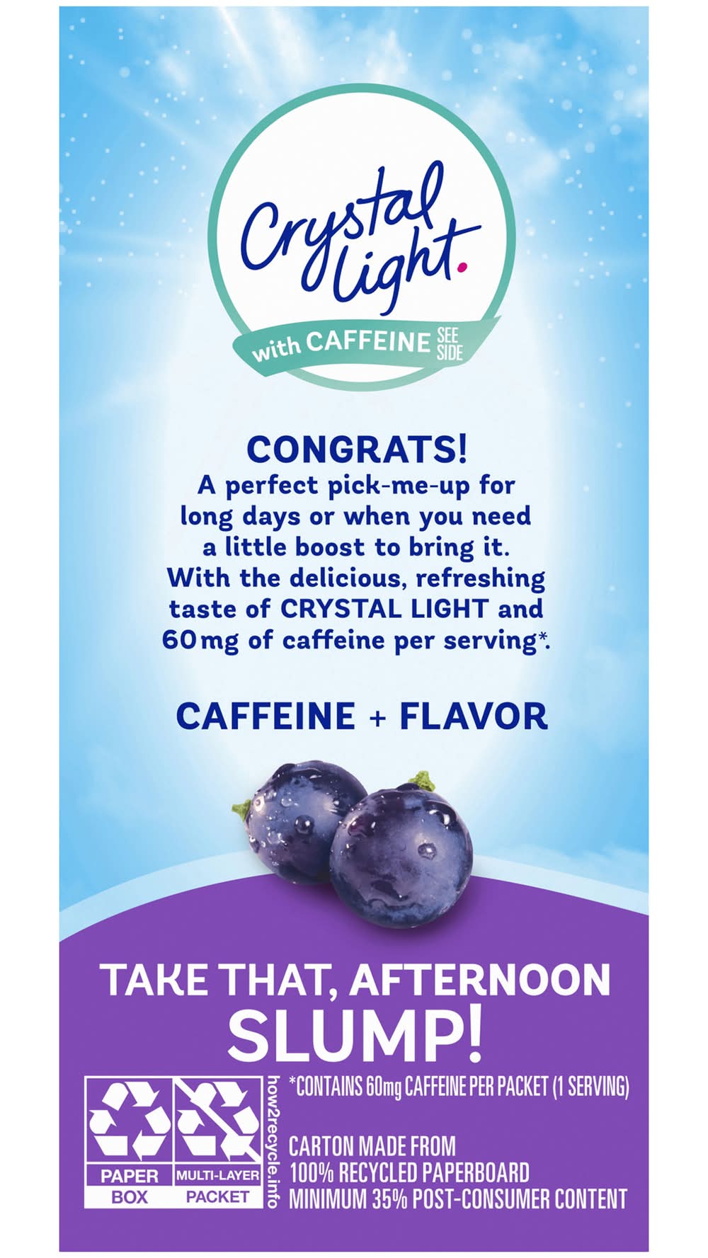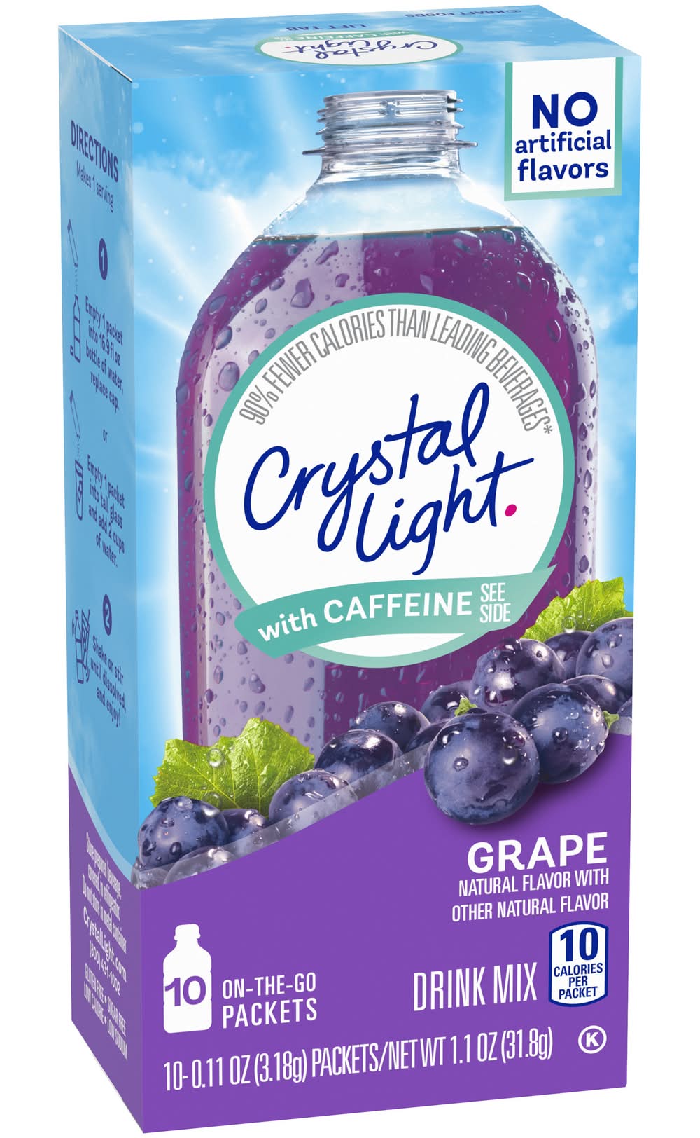 Crystal light sugar free grape with caffeine powdered energy drink mix is a deliciously fruity drink you can enjoy anywhere. With zero grams of sugar and 10 calories per packet, crystal light is a sweet alternative to juice and soda and has 90 percent fewer calories than leading beverages, so you don't have to choose between taste and calories. Each packet also has 60 milligrams of caffeine so you can be at your best all day long. Each 0. 11 ounce individual energy drink packet fits easily in your bag, desk, or car, so you can enjoy a refreshing glass of crystal light anywhere. Simply empty one drink mix packet into a bottle of water or a glass with 2 cups of water, shake or stir, and enjoy. • Flavor: Grape • Kraft Heinz Foods Company, Chicago, Il, 60601. • Packaging: Reusable