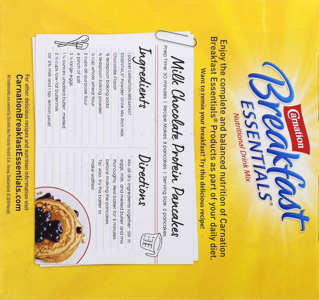CARNATION BREAKFAST ESSENTIALS® Original Powder Drink Mix Rich Milk Chocolate 22 x 1.26oz • Flavor: Rich milk chocolate • Number of servings: 22 • Packaging: Reusable
