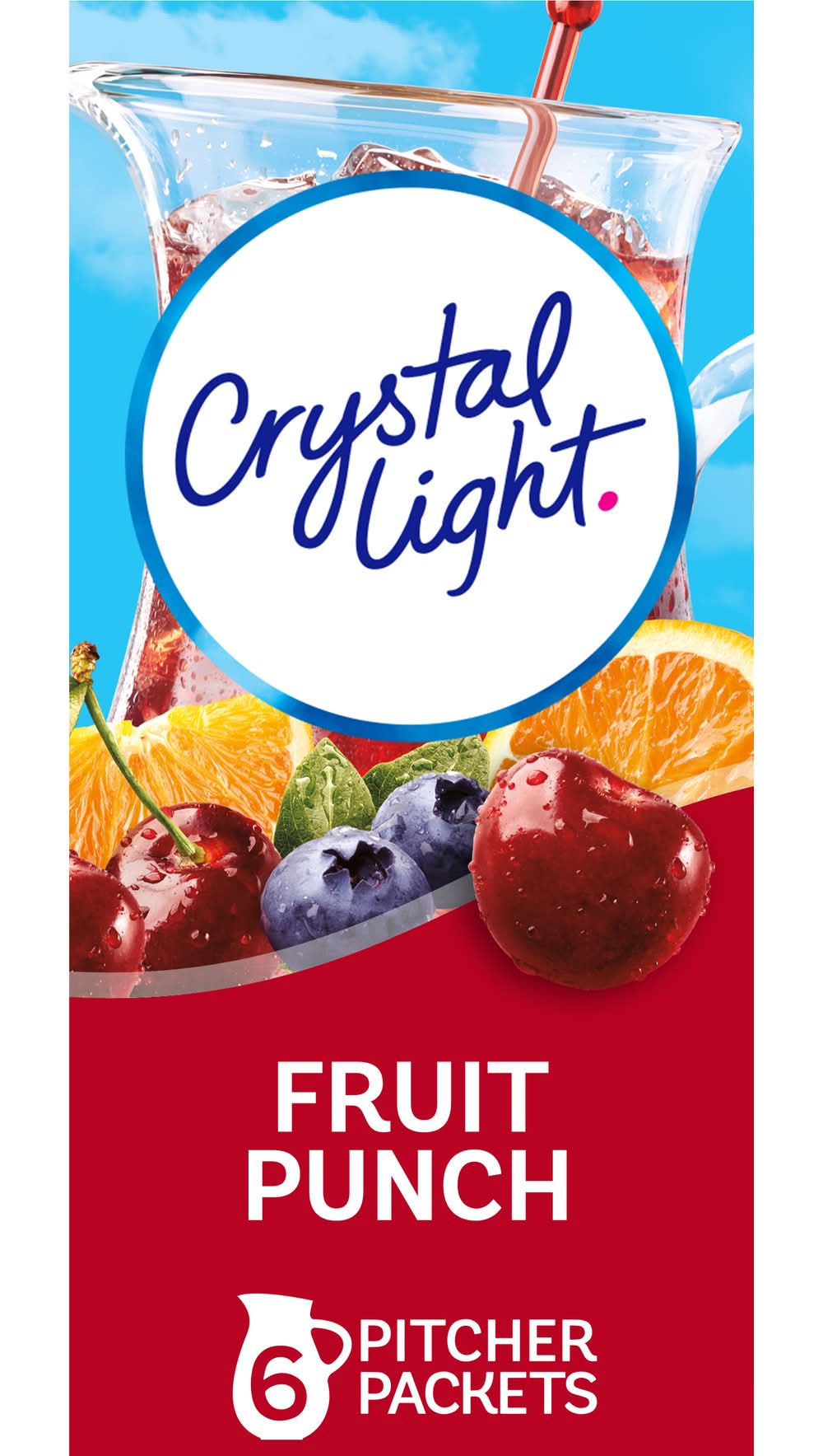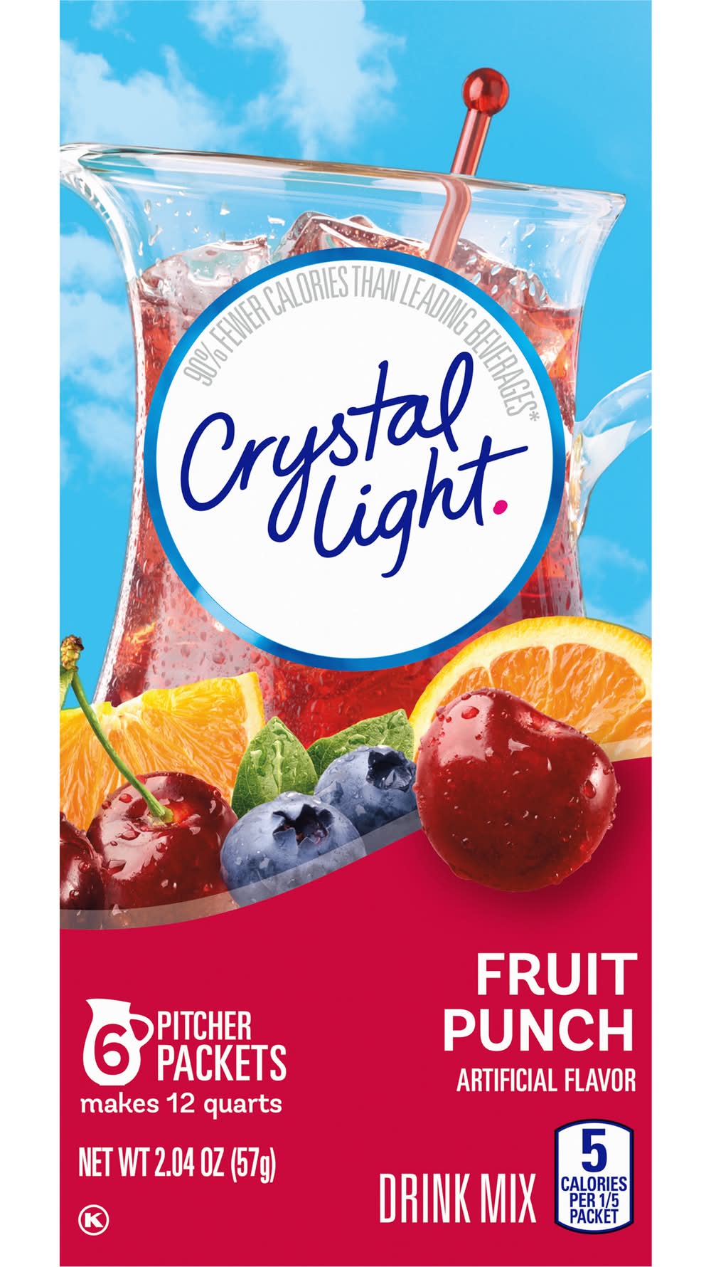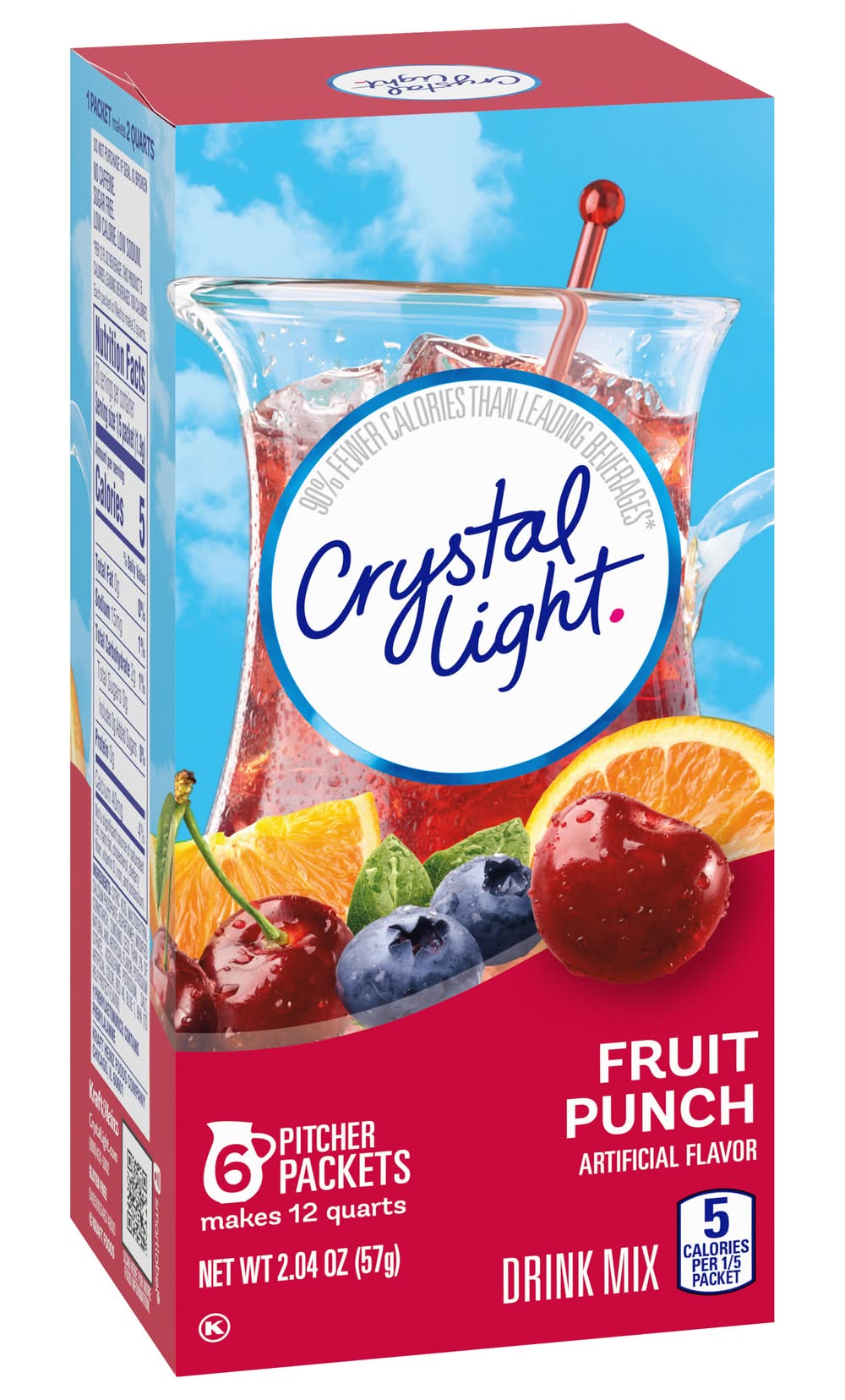 Crystal Light Artificially Flavored Fruit Punch Powdered Drink Mix is a refreshing beverage you can enjoy at any time of day. With zero grams of sugar and only 5 calories per serving, Crystal Light is a sweet alternative to juice and soda and has 90 percent fewer calories than leading beverages (this product 5 calories, leading beverages 70 calories), so you don't have to choose between taste and calories. It offers a classic fruit punch flavor for a refreshing taste. Each pitcher packet of powdered fruit punch mix in this 6 count canister is perfectly portioned to make 2 quarts or 1 pitcher of Crystal Light, so there's plenty to share with family and friends. Simply mix one packet of fruit punch powder with 8 cups or 2 quarts of water, stir, and enjoy! All the flavor and only 5 calories, just the way you like it. • Flavor: Fruit punch • Kraft Heinz Foods Company, Chicago,IL,60601 • Packaging: Reusable