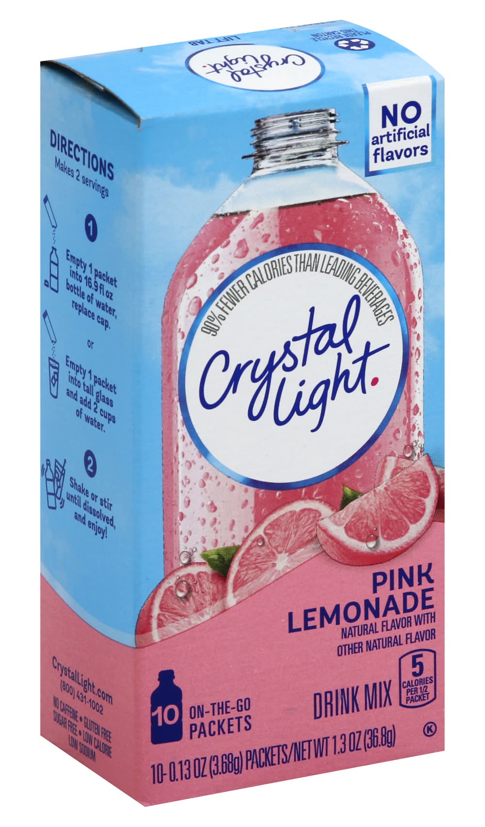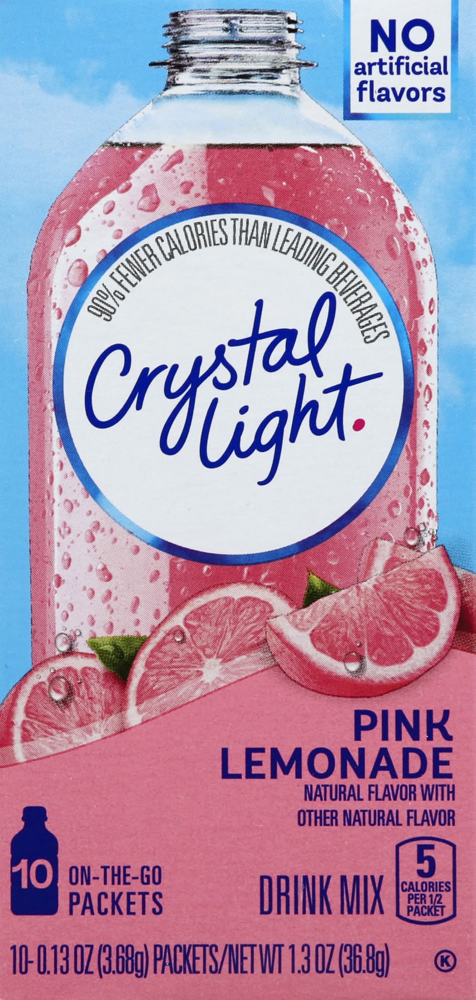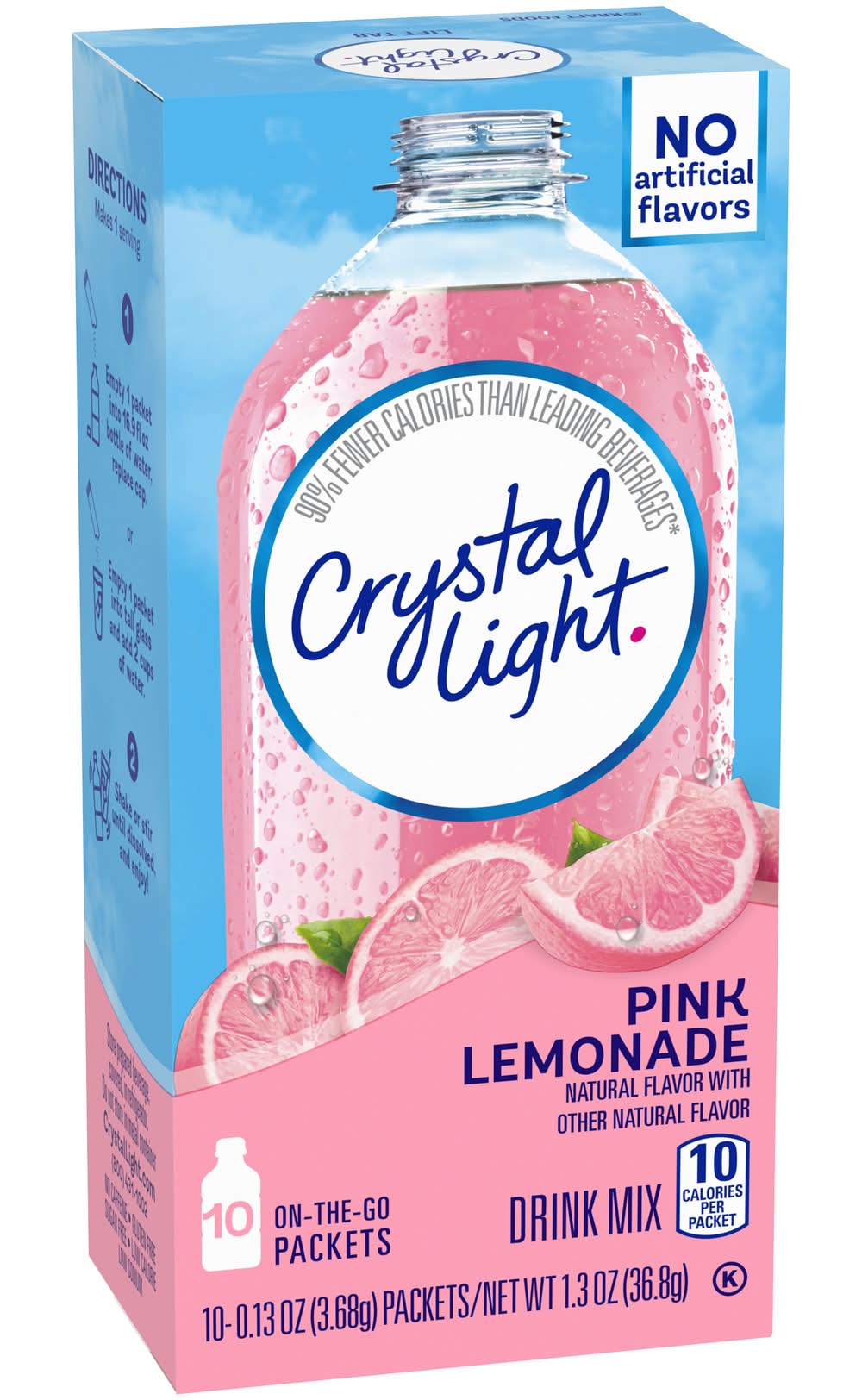 Crystal Light Pink Lemonade Powdered Drink Mix is a refreshing beverage you can enjoy at any time of day. With zero grams of sugar and only 5 calories per serving, Crystal Light lemonade mix is a sweet alternative to juice and soda and has 90 percent fewer calories than leading beverages (this product 5 calories, leading beverages 70 calories), so you dont have to choose between taste and calories. It's also made with natural flavors for a refreshingly smooth taste. Each 0.13 ounce packet of powdered lemonade mix is perfectly portioned to flavor a bottle of water with Crystal Light sugar free lemonade, so you can enjoy the flavor on the go. Simply mix one lemonade packet with a bottle or glass of water, shake or stir, and enjoy! All the flavor and only 5 calories. just the way you like it. • Flavor: Pink lemonade • Kraft Foods, Northfield, IL 60093-2753,Northfield, IL • Packaging: Reusable