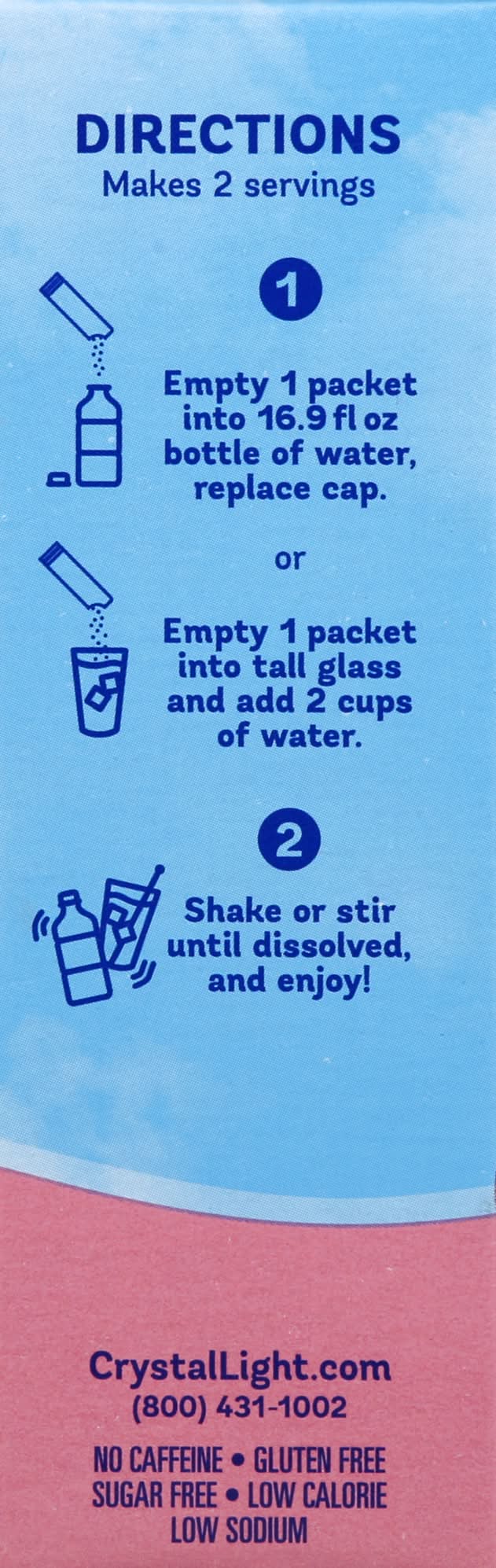 Make 2 servings: 1. empty 1 packet into 16.9 fl oz bottle of water, replace cap or empty 1 packet into tall glass and add 2 cups of water. 2. shake or stir until dissolved, and enjoy!