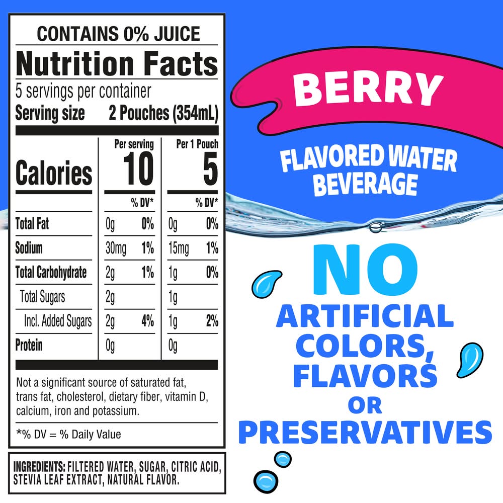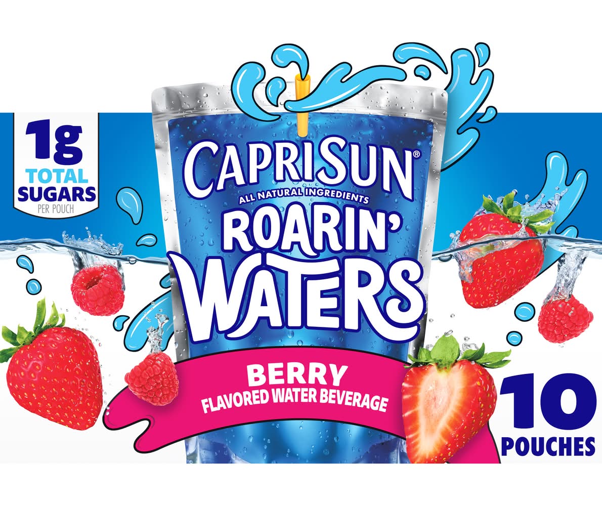 Take hydration to the next level with Capri Sun Roarin’ Waters Berry Flavored with other natural flavor Water Beverage. Our new formula is sweetened with stevia and sugar. Berry features the sweet essence of strawberries and raspberries. Always a kids' favorite, our flavored water is so tasty even parents can't resist sneaking a pouch or two! Capri Sun Roarin’ Waters Berry Flavored Water Beverage comes in the iconic Capri Sun 6 fluid ounce pouch so it’s easy to help kids stay hydrated at lunch, on the playground or after school. Each box contains 10 convenient pouches filled with fruity flavored water. Capri Sun Roarin' Waters is sure to make kids ROAR! • Flavor: Berry • Pack size: 10 • Packaging: Reusable