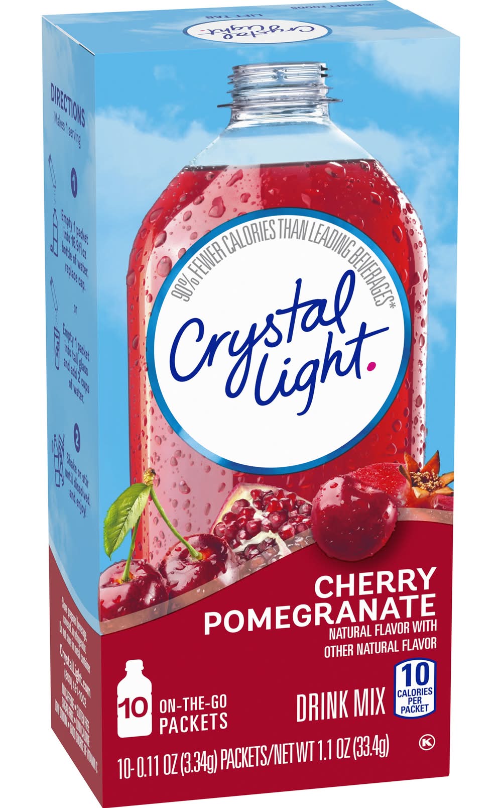 Crystal Light Sugar Free Cherry Pomegranate Powdered Drink Mix is a deliciously fruity drink you can enjoy anywhere. With zero grams of sugar and 10 calories per packet, Crystal Light fruit drink mix is a sweet alternative to juice and soda and has 90 percent fewer calories than leading beverages (this product 10 calories, leading beverages 70 calories), so you dont have to choose between taste and calories. This 0.11 ounce individual powdered fruit drink packet fits easily in your bag, desk, or car, so you can enjoy a refreshing glass of Crystal Light anywhere. Simply empty one packet into a bottle of water or a glass with 2 cups of water, shake or stir, and enjoy! All the flavor and only 10 calories per packet... just the way you like it. • Number of servings: 10 • Kraft Heinz Foods Company, Chicago, IL, 60601 • Packaging: Reusable