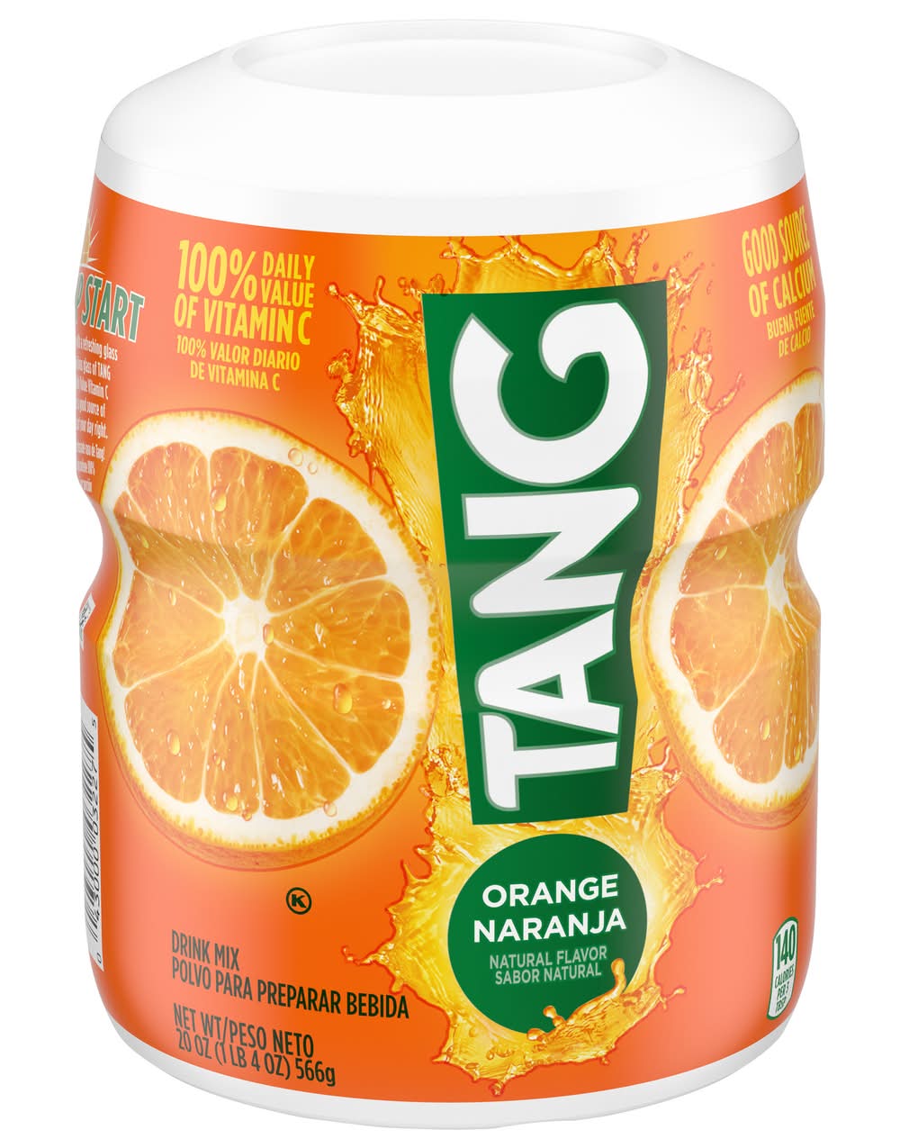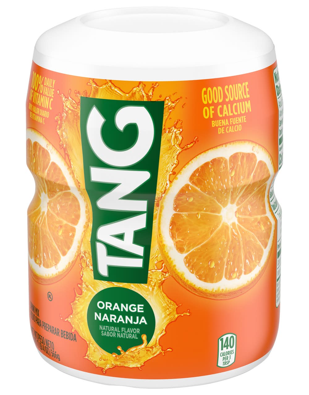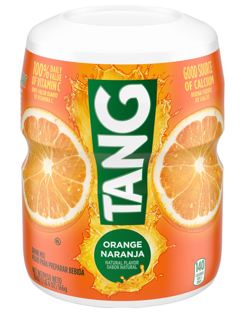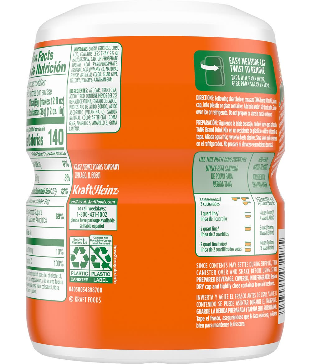 Tang Naturally Flavored Orange Powdered Drink Mix is a great way to jump start your day. Made with a refreshingly sweet orange taste, Tang has 100% of your Daily Value of Vitamin C and is a good source of calcium. This Tang Naturally Flavored Orange Powdered Drink Mix comes in a resealable canister to help lock in flavor and with an easy-measure lid for simple, fast preparation. Each 20 ounce canister makes 6 quarts of product, so there is enough for the whole family to enjoy! To prepare, simply pour the powdered orange drink mix into plastic or glass pitcher, add water, stir, and enjoy! Start your day off right with the refreshing taste of Tang! • Flavor: Orange • Kraft Heinz Foods Company, Chicago,IL,60601 • Packaging: Reusable