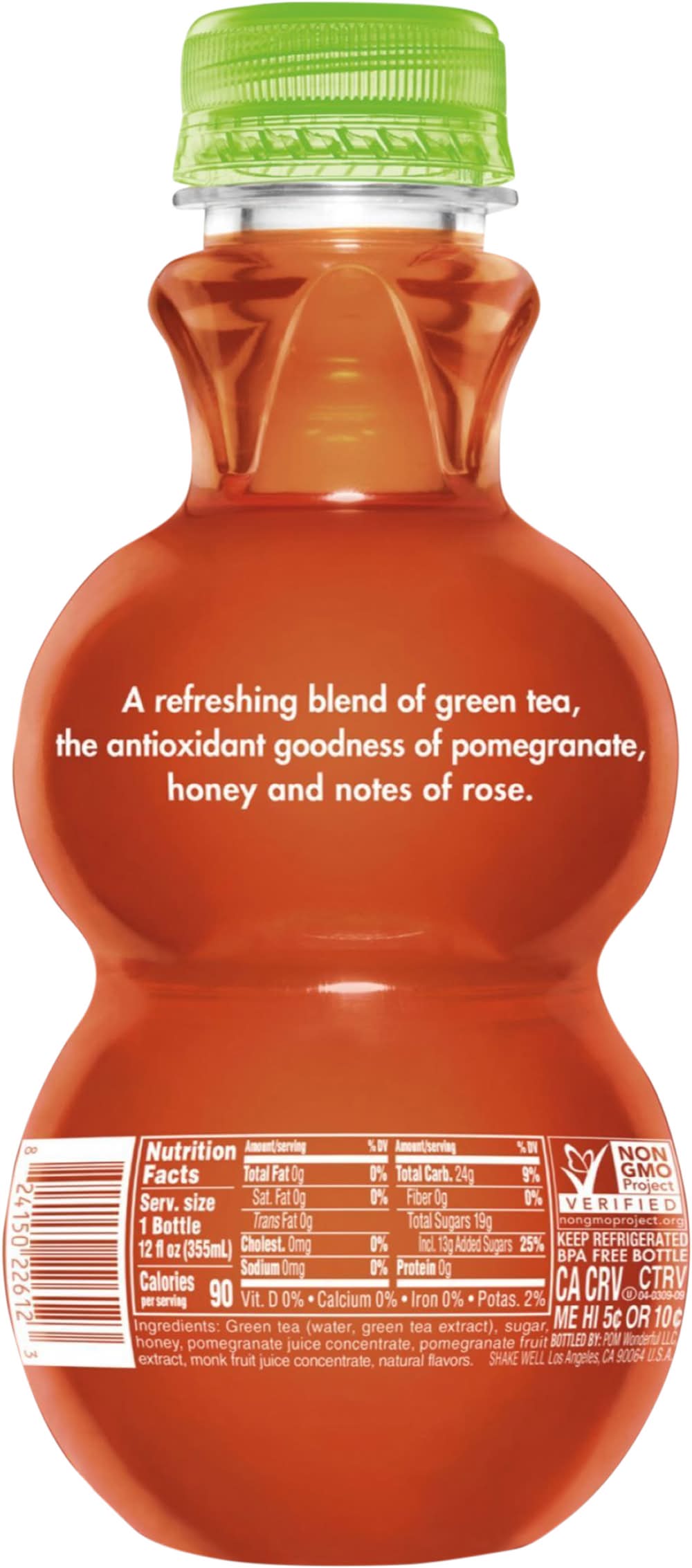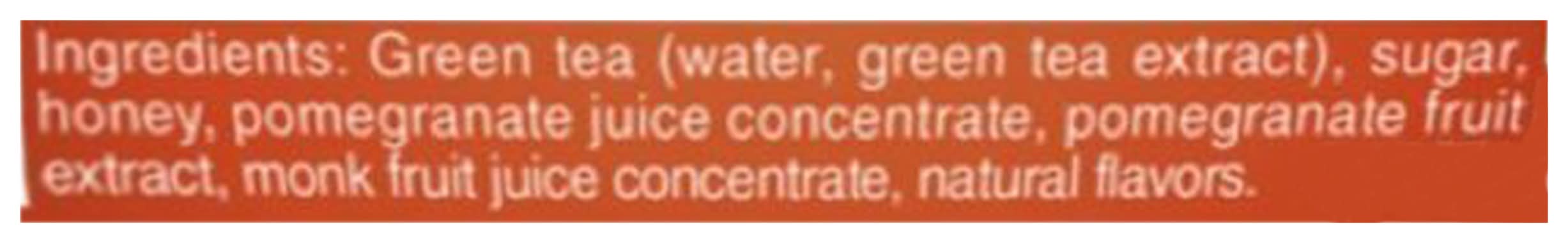 Ingredients: Green Tea (Water, Green Tea Extract), Sugar, Honey, Pomegranate Juice Concentrate, Pomegranate Fruit Extract, Monk Fruit Juice Concentrate, Natural Flavors