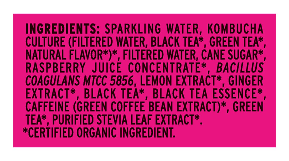 Ingredients: Sparkling Water, Kombucha Culture (Filtered Water, Black Tea*, Green Tea*, Natural Flavor*)*, Filtered Water, Cane Sugar*, Raspberry Juice Concentrate*, Bacillus Coagulans Mtcc 5856, Lemon Extract*, Ginger Extract*, Black Tea*, Black Tea Essence*, Caffeine (Green Coffee Bean Extract), Green Tea*, Purified Stevia Leaf Extract*. * Certified Organic Ingredient