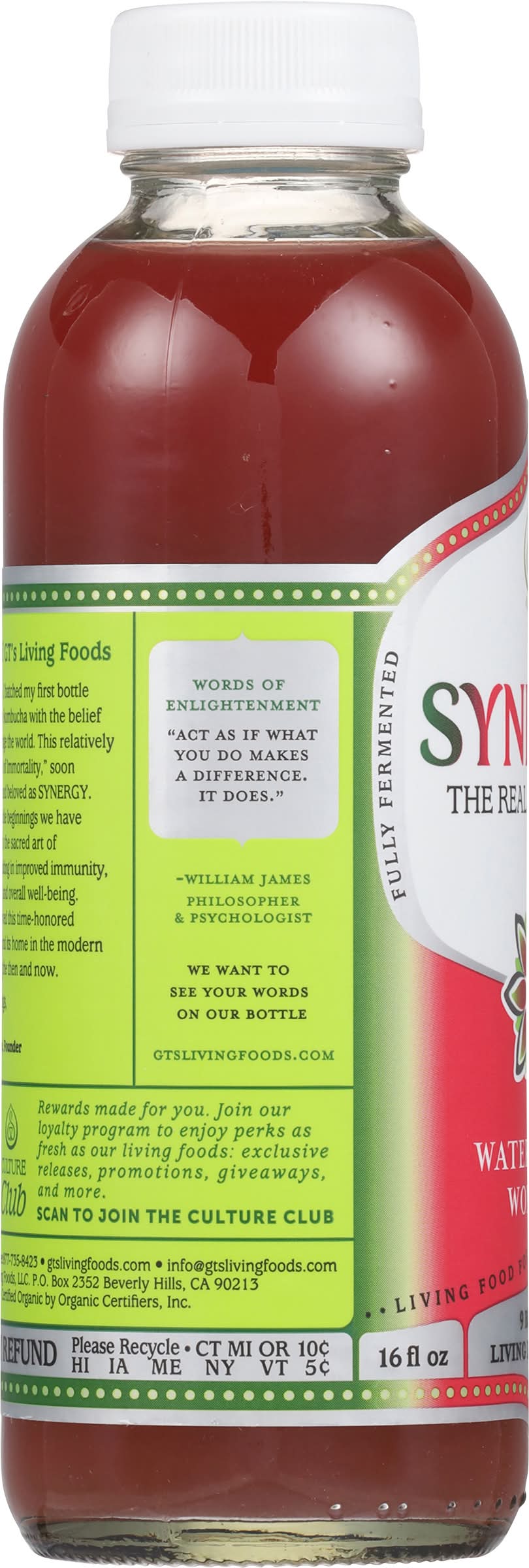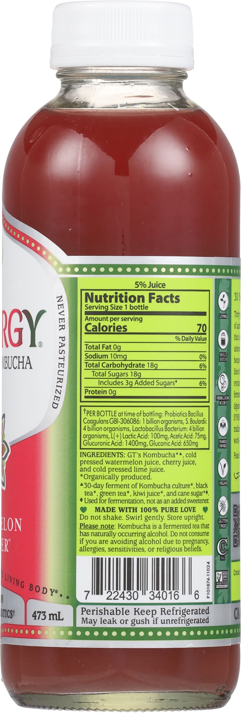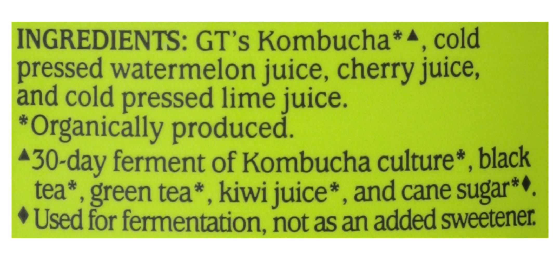 Ingredients: GT’s Kombucha*(a), Cold Pressed Watermelon Juice, Cherry Juice, and Cold Pressed Lime Juice. (a) 30-Day Ferment of Kombucha Culture*, Black Tea*, Green Tea*, Kiwi Juice*, and Cane Sugar*(b). *Organically Produced. (b) Used for Fermentation, Not as an Added Sweetener