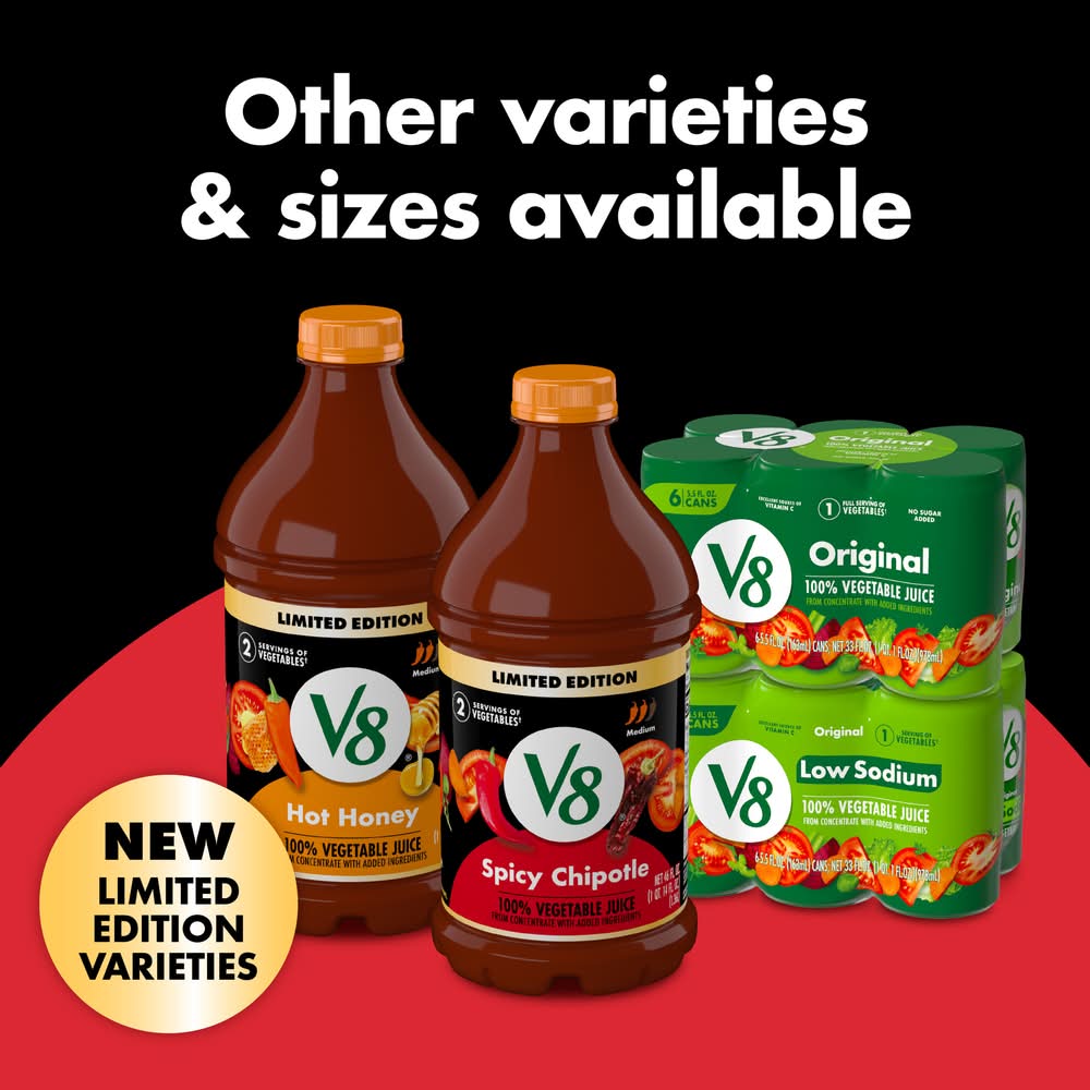 Savor the bold and fiery goodness of V8 Spicy Chipotle 100% Vegetable Juice. Featuring roasted red peppers, dehydrated chili and chipotle peppers, and natural smoke flavoring, this spicy V8 juice is made with concentrated tomato juice along with the juices of seven other vegetables. The result is a 100% juice with a distinctly rich, savory flavor and a Medium heat level. Delicious and nutritious, V8 vegetable juice is an easy way to help get your daily recommended veggies. Each 8 fl oz serving contains 2 servings of vegetables and is an excellent source of Vitamins A and C.* Our veggie juice is also gluten free with no artificial colors. Enjoy V8 Spicy Chipotle 100% Vegetable Juice on its own, over ice, or adorned with your favorite garnishes. It’s great as a breakfast drink, afternoon snack, or post workout drink. In addition to sipping it as a vegetable drink, you can also use V8 to add flavor and nutrition to a variety of dishes. Try it as a vegetable soup base, substitute it for broth in stews, or use it as a marinade. (*See nutrition facts for sodium content) Packaging: Reusable