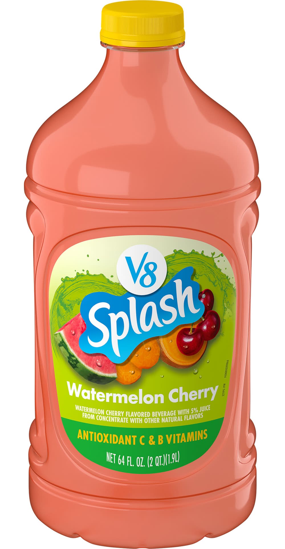 V8 Splash Watermelon Cherry Flavored Beverage is a fruity burst of refreshment that the whole family can enjoy. Made with 5% juice, it's packed with watermelon and cherry flavors for a taste that feels like summer in every sip. With antioxidant Vitamin C and B vitamins, this drink is more than delicious. Whether you're packing lunches for back-to-school or planning a sunny summer vacation, V8 Splash Watermelon Cherry fits right in. Serve it at breakfast for a refreshing start to the day, or pour it over ice for a cool treat by the pool. Hosting a backyard barbecue? Add V8 Splash Watermelon Cherry to your drink station for a splash of fruity fun. You can even mix it into smoothies for a fruity boost, or use it to create colorful mocktails that kids and adults will love. V8 Splash Watermelon Cherry Flavored Beverage is a vegetarian-friendly fruit juice beverage everyone can enjoy. Its vibrant fruity taste makes it perfect for everyday and for special occasions. Whether you're enjoying it straight from the glass or adding it to creative drinks like smoothies or mocktails, it's sure to brighten your day. Packed with flavor and versatility, V8 Splash brings a little more fun to family time. • Campbell soup company, Camden,NJ,09103-1701,USA • Packaging: Reusable