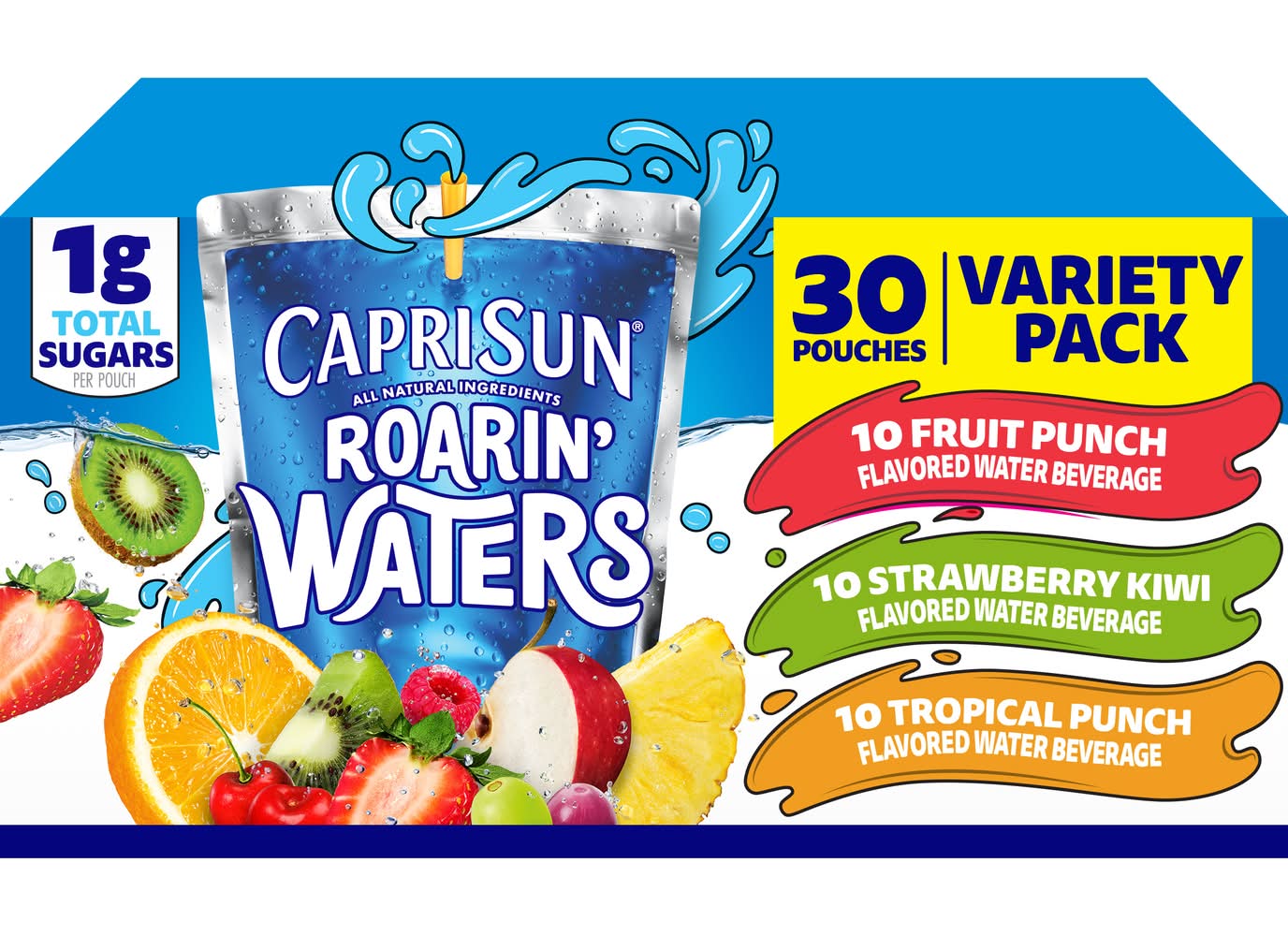 Take hydration to the next level with Capri Sun Roarin' Waters Fruit Punch, Strawberry Kiwi and Tropical Punch Flavored Water Beverage Variety Pack. Our new formula is sweetened with stevia and sugar. Always a kids' favorite, our flavored water is so tasty even parents can't resist sneaking a pouch or two! Capri Sun flavored water comes in the iconic Capri Sun 6 fluid ounce pouch so it’s easy to help kids stay hydrated at school, on the playground or during practice. Each box contains 30 convenient pouches filled with fruity flavored water. Capri Sun Roarin' Waters is sure to make kids ROAR! Pack size: 30