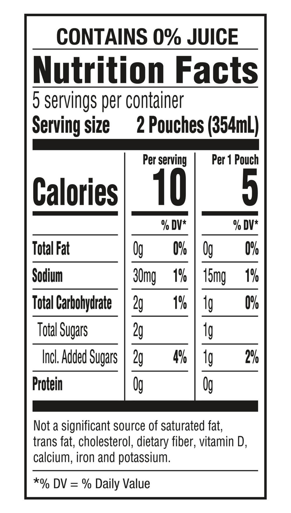 Ingredients: TROPICAL PUNCH FILTERED WATER, SUGAR, CITRIC ACID, STEVIA LEAF EXTRACT, NATURAL FLAVOR. STRAWBERRY KIWI FILTERED WATER, SUGAR, CITRIC ACID, STEVIA LEAF EXTRACT, NATURAL FLAVOR. FRUIT PUNCH FILTERED WATER, SUGAR, CITRIC ACID, STEVIA LEAF EXTRACT, NATURAL FLAVOR.