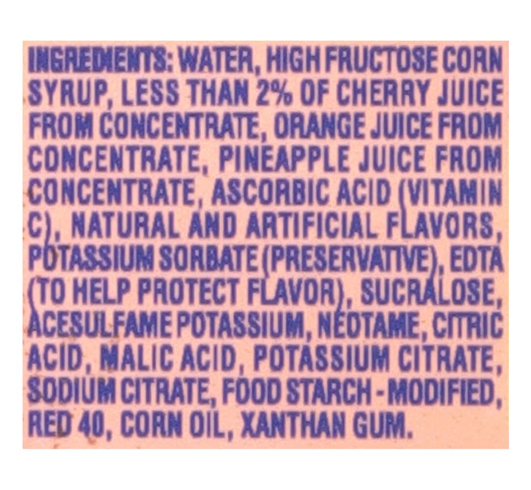 Ingredients: Water, High Fructose Corn Syrup, Less than 2% of Cherry Juice from Concentrate, Orange Juice from Concentrate, Pineapple Juice from Concentrate, Ascorbic Acid (Vitamin C), Natural and Artificial Flavors, Potassium Sorbate (Preservative), EDTA (to Help Protect Flavor), Sucralose, Acesulfame Potassium, Neotame, Citric Acid, Malic Acid, Potassium Citrate, Sodium Citrate, Food Starch - Modified, Red 40, Corn Oil, Xanthan Gum Contains: Corn