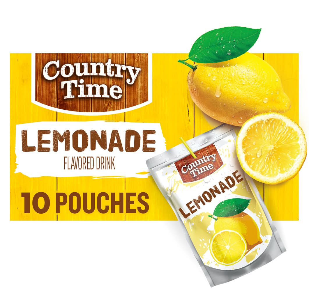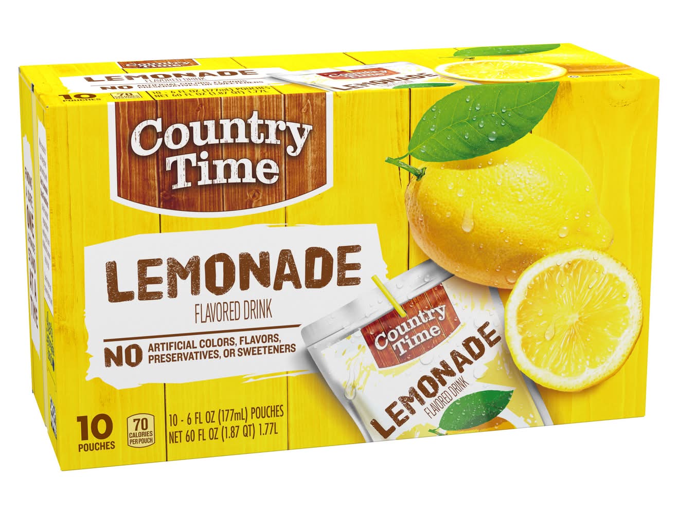 Make any time summertime with Country Time Lemonade Ready to Drink Pouches. It’s the same refreshing taste you love, now in a convenient grab-and-go pouch. Whether you want to brighten up a school lunch, quench your thirst at snack time or satisfy a crowd at your next backyard BBQ, Country Time Lemonade brings the perfect balance of sweet and tart, packing a bright lemon flavor that will leave you smiling. Country Time Lemonade flavored drink pouches are made with no artificial flavors, colors, preservatives or sweeteners, so you can feel good about giving your family a quality beverage. Each box contains 10 convenient pouches filled with 6 ounces of irresistible Country Time Lemonade. Enjoy a sip of sunshine with Country Time Lemonade Ready to Drink Pouches. • Pack size: 10 • Packaging: Reusable