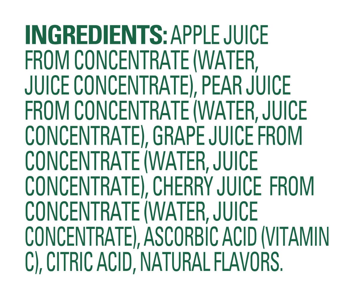 Ingredients: Apple Juice from Concentrate (Water, Juice Concentrate), Pear Juice from Concentrate (Water, Juice Concentrate), Grape Juice from Concentrate (Water, Juice Concentrate), Cherry Juice from Concentrate (Water, Juice Concentrate), Ascorbic Acid (Vitamin C), Citric Acid, Natural Flavors.