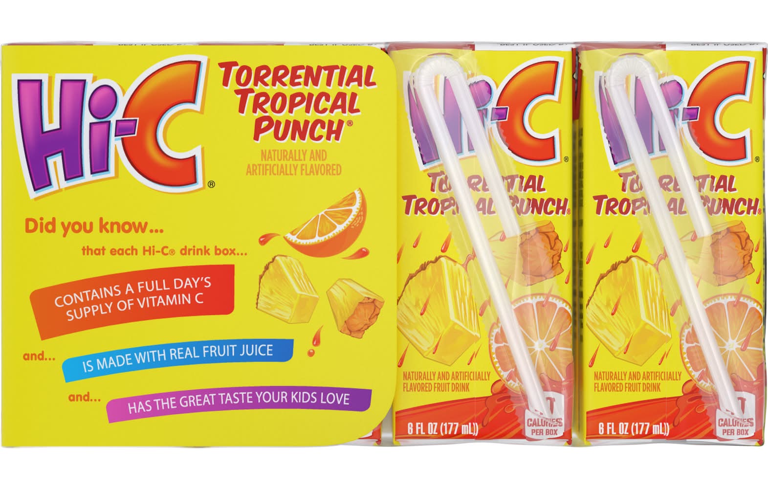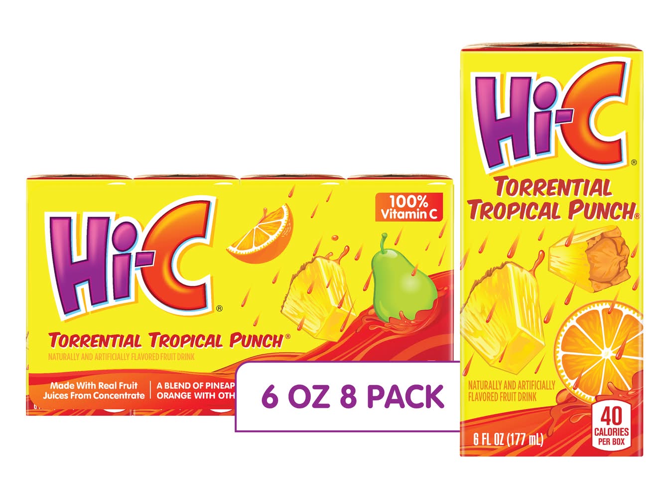 Flavor your fun with real fruit juice. Anytime. Anywhere. Each Hi-C drink box contains a full day's supply of Vitamin C, is made with real fruit juice, and has the great taste your kids love. Let the flavor rain down as you take your taste buds on a tropical trip with the perfect mix of pineapple, pear, and orange. Available in convenient and portable 6 fl oz juice boxes. • Flavor: Torrential tropical punch • Pack size: 8 • The Coca-Cola Company, Atlanta, GA, 30313 • Packaging: Reusable
