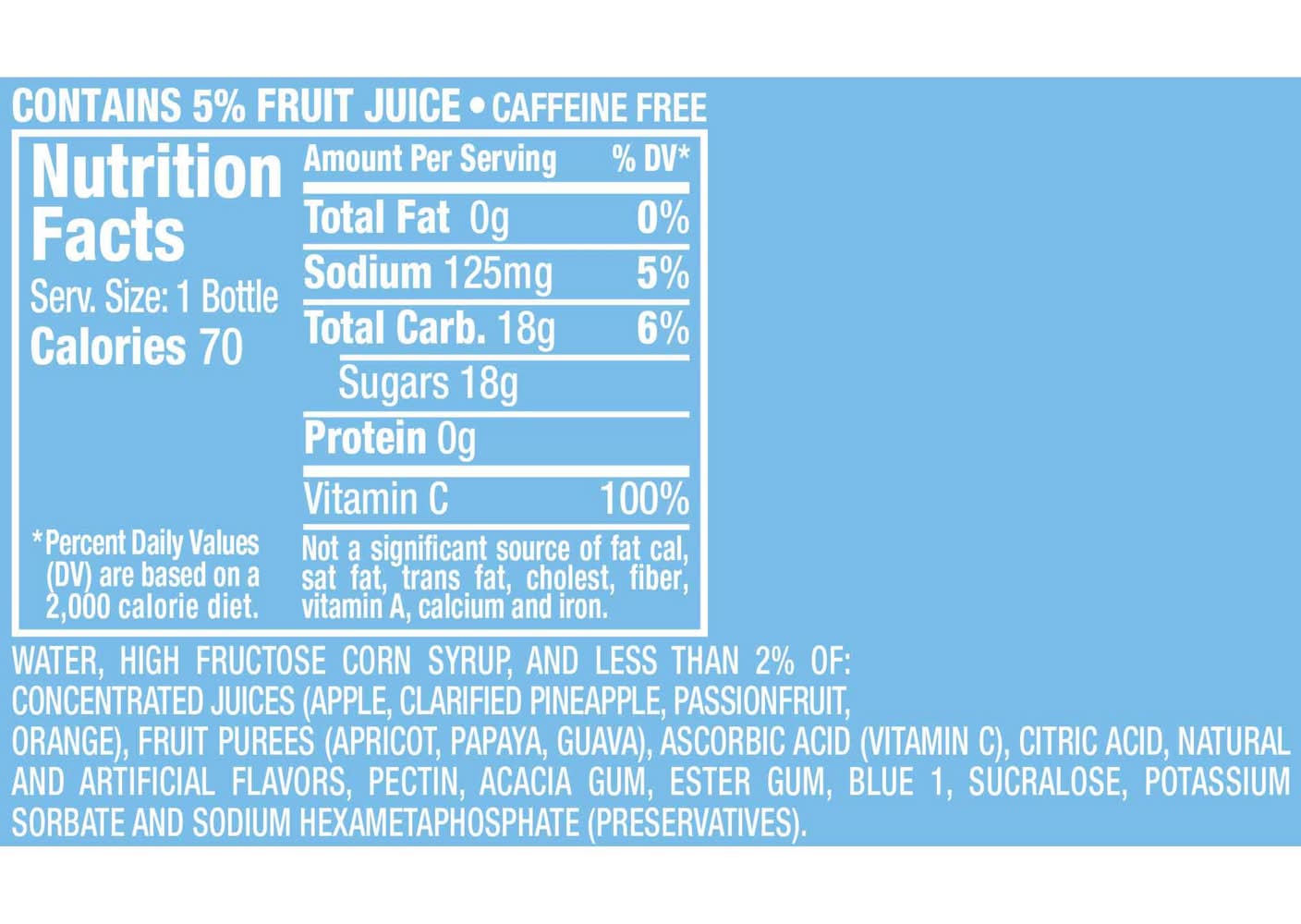 Ingredients: Water, High Fructose Corn Syrup, and Less than 2% of: Concentrated Juices Apple, Clarified Pineapple, Passionfruit, Orange, Fruit Purees Apricot, Papaya, Guava, Ascorbic Acid Vitamin C, Citric Acid, Natural and Artificial Flavors, Pectin, Acacia Gum, Ester Gum, Blue 1, Sucralose, Potassium Sorbate and Sodium Hexametaphosphate Preservatives. Contains: 'Corn Contains', 'Gluten Free From'