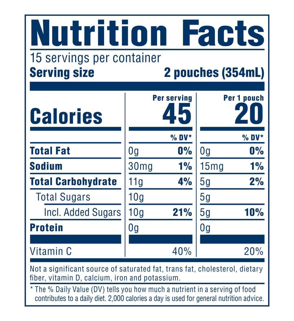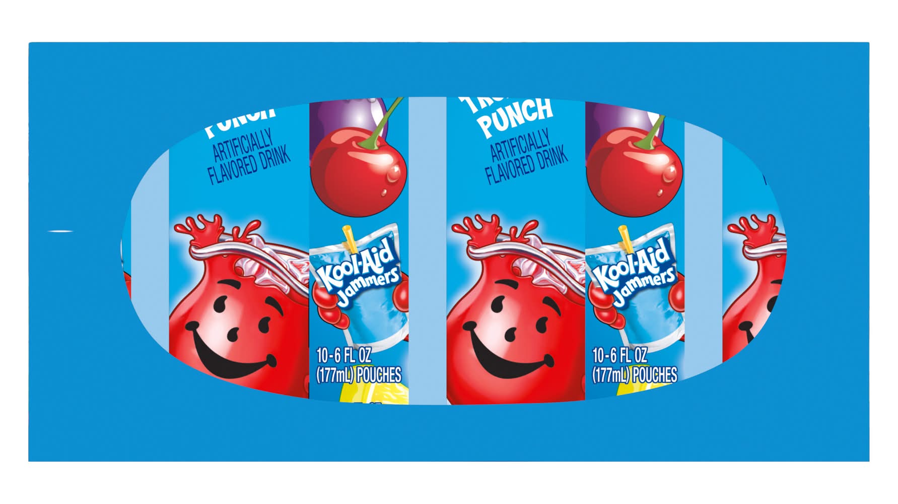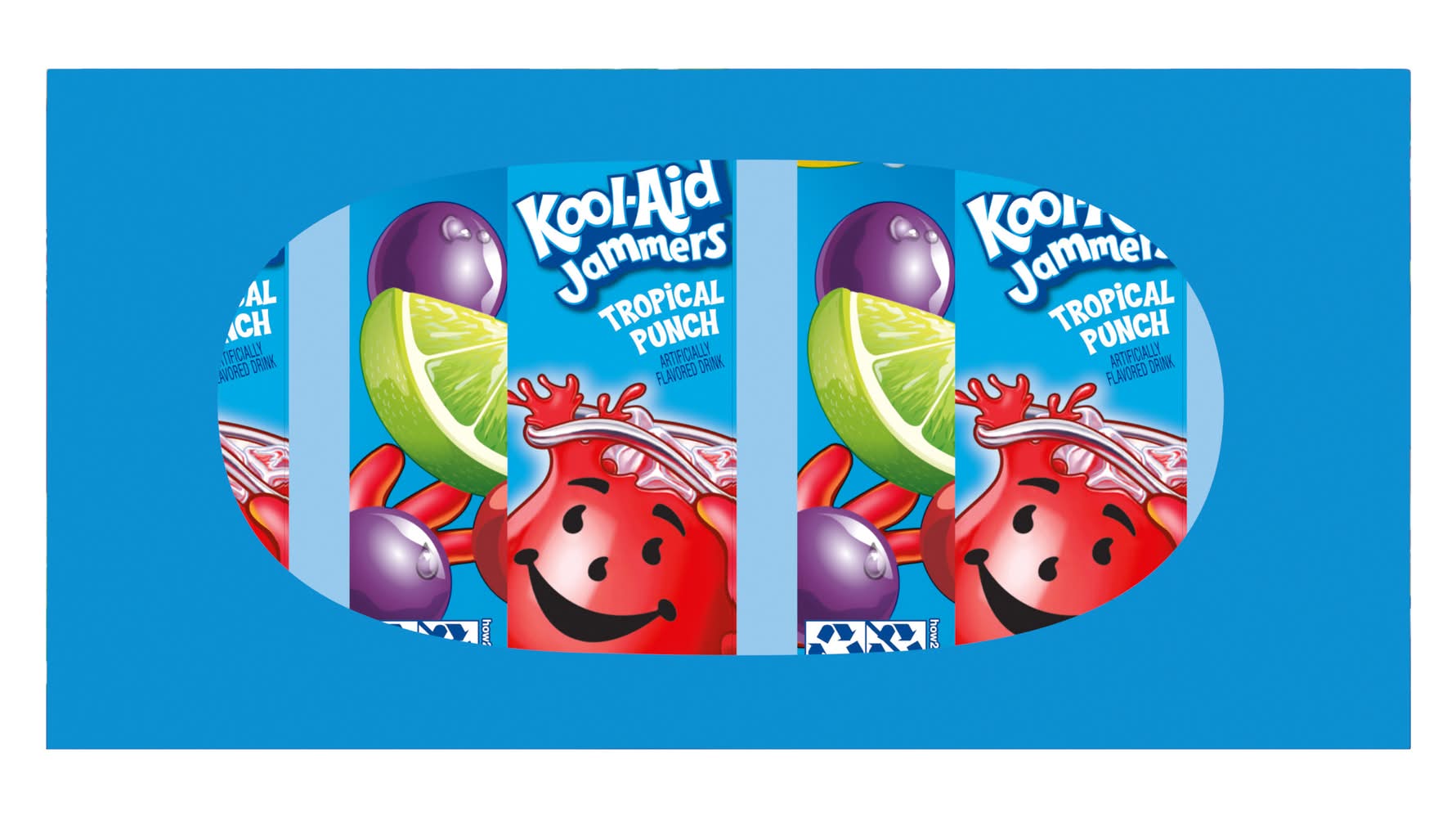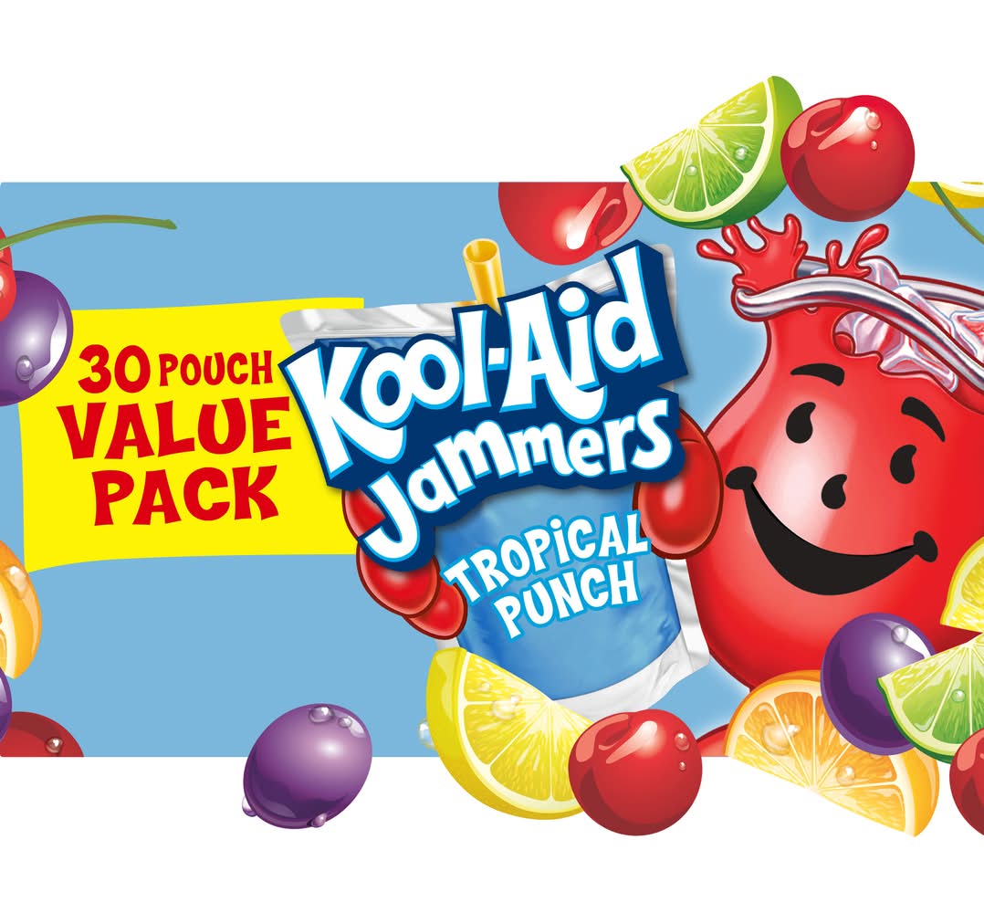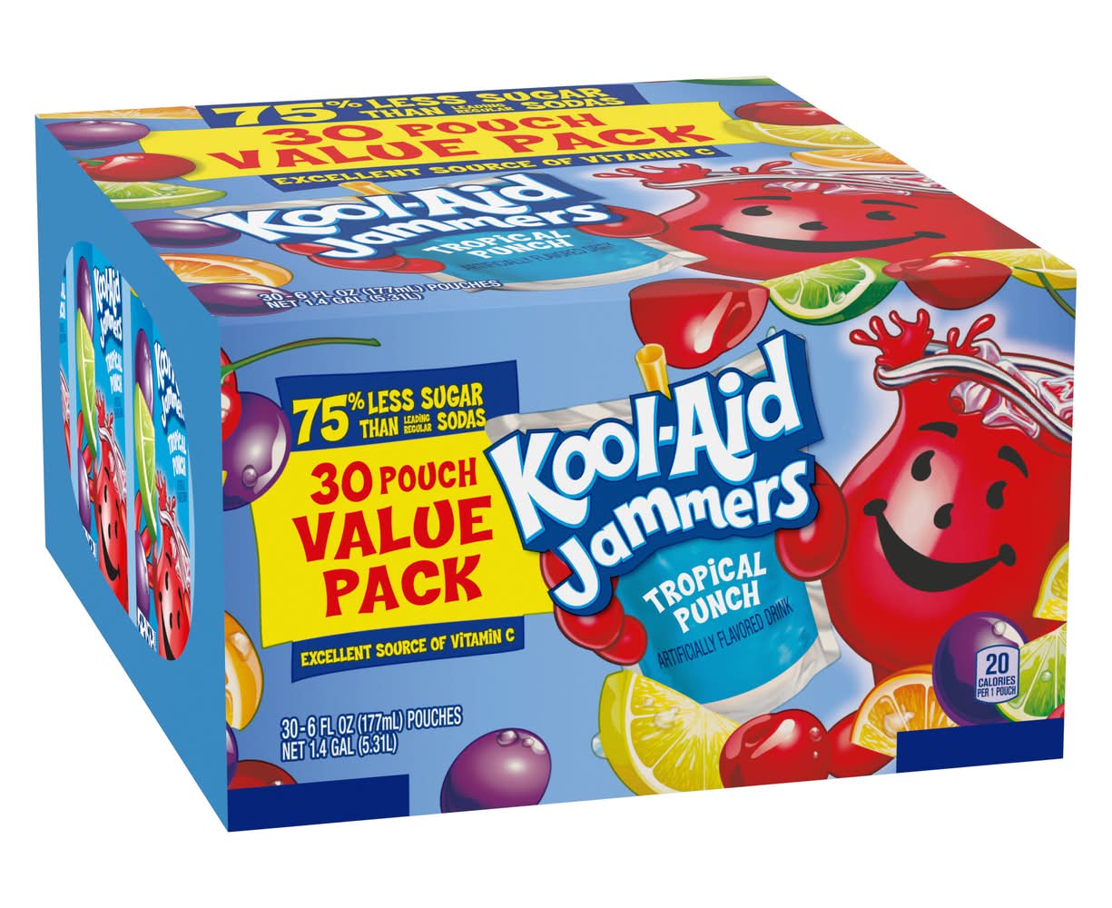Kool-Aid Jammers Artificially Flavored Tropical Punch Drink Pouches deliver fun with a sweet blend of mixed fruit flavors. Our delicious kids drink contains 75% less sugar than leading regular sodas (per 12 fl oz, this product 10g total sugar, leading regular sodas 40g total sugar), making it a great artificially fruit flavored drink for kids. Packed in a convenient drink pouch, kids can enjoy Kool-Aid at home, on the beach or during lunchtime. Each box of artificially flavored tropical punch Kool-Aid Jammers contains ten 6 fluid ounce drink pouches. Enjoy flavorful fun made easy. Available in a rainbow of flavors! • Pack size: 30 • Kraft Heinz Foods Company, Chicago, IL, 60601
