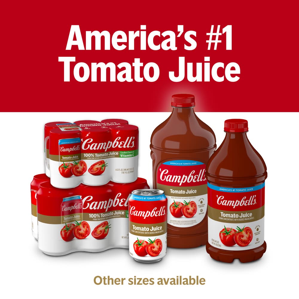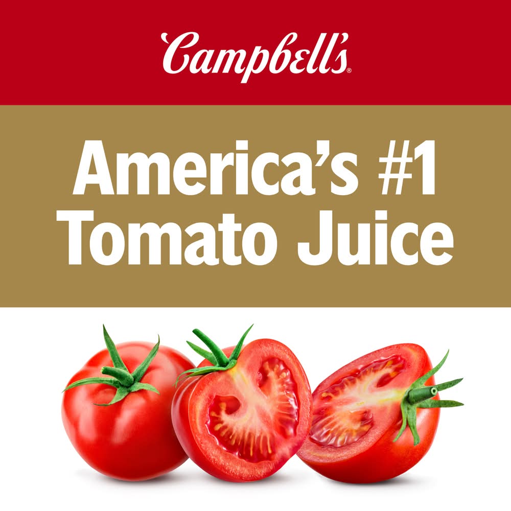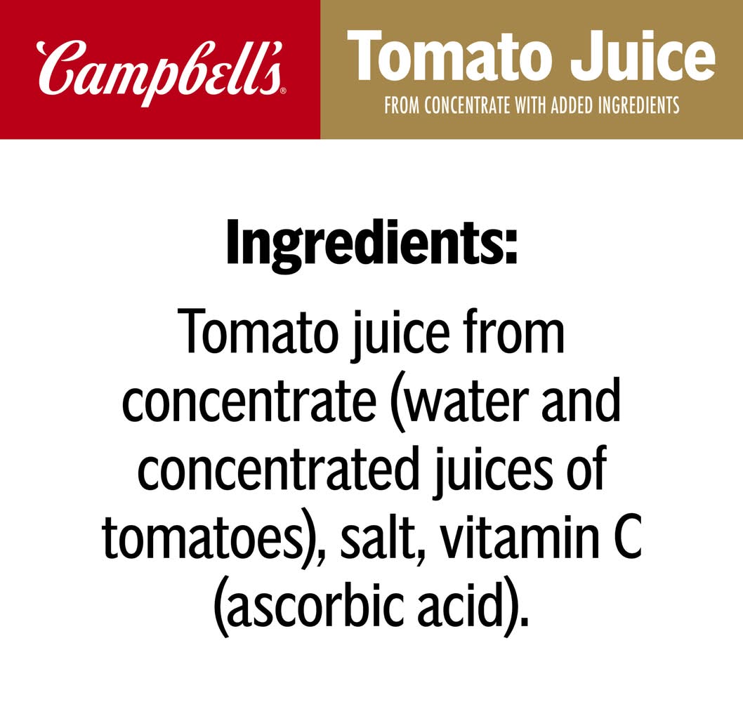 Campbell's 100% Tomato Juice is the rich, delicious vegetable juice that brings the sun-ripened taste of peak-season tomatoes to every sip. Made with tomatoes picked at their best and no added sugars, no artificial flavors, and no high fructose corn syrup, this non-GMO juice is packed with tomato juice goodness. Every glass is an excellent source of vitamin C, making it a satisfying and refreshing choice you can feel good about. Perfectly pure and full of flavor, it's America's #1 tomato juice for a reason. Start your day with a glass of Campbell's Tomato Juice alongside your breakfast or enjoy it as a quick, satisfying afternoon pick-me-up. Hosting friends and family? It's the perfect base for mocktails and cocktail mixers—try it in a classic Bloody Mary or create your own signature drink! No matter how you use it, this versatile vegetable juice is a pantry staple that fits into every part of your day. Campbell's 100% Tomato Juice is gluten-free, vegetarian, and made with care, using only the best ingredients. It's more than just veggie juice—it's satisfying flavor that's there for you whenever you need it. From breakfast to happy hour, every sip is a reminder of the simple joy that comes from quality ingredients. Pour a glass and experience the timeless taste of Campbell's Tomato Juice today. • Pack size: 6 • Campbell Soup Company, Camden,NJ,08103-1701 • Packaging: Reusable