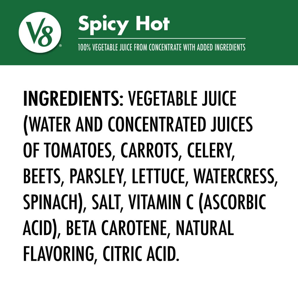 Savor the goodness of V8 Spicy Hot 100% Vegetable Juice. A satisfying alternative to other juices, this spicy V8 juice is made with concentrated tomato juice along with the juices of seven other vegetables. The result is a 100% juice with a distinctly rich, savory flavor and the perfect amount of spice. Delicious and nutritious, V8 vegetable juice is an easy way to help get your daily recommended veggies. Each 8 fl oz serving contains 2 servings of vegetables and is an excellent source of Vitamins A and C.* Our veggie juice is also gluten free and non GMO with no sugar added.** Enjoy V8 Spicy Hot Vegetable Juice on its own, over ice, or seasoned with pepper and adorned with your favorite garnishes. It’s great as a breakfast drink, afternoon snack, or post workout drink. In addition to sipping it as a vegetable drink, you can also use V8 to add flavor and nutrition to a variety of dishes. Try it as a vegetable soup base, substitute it for broth in stews, or use it as a marinade. (*See nutrition panel for sodium content **Not a low calorie food; see nutrition panel for sugar and calorie content) Packaging: Reusable