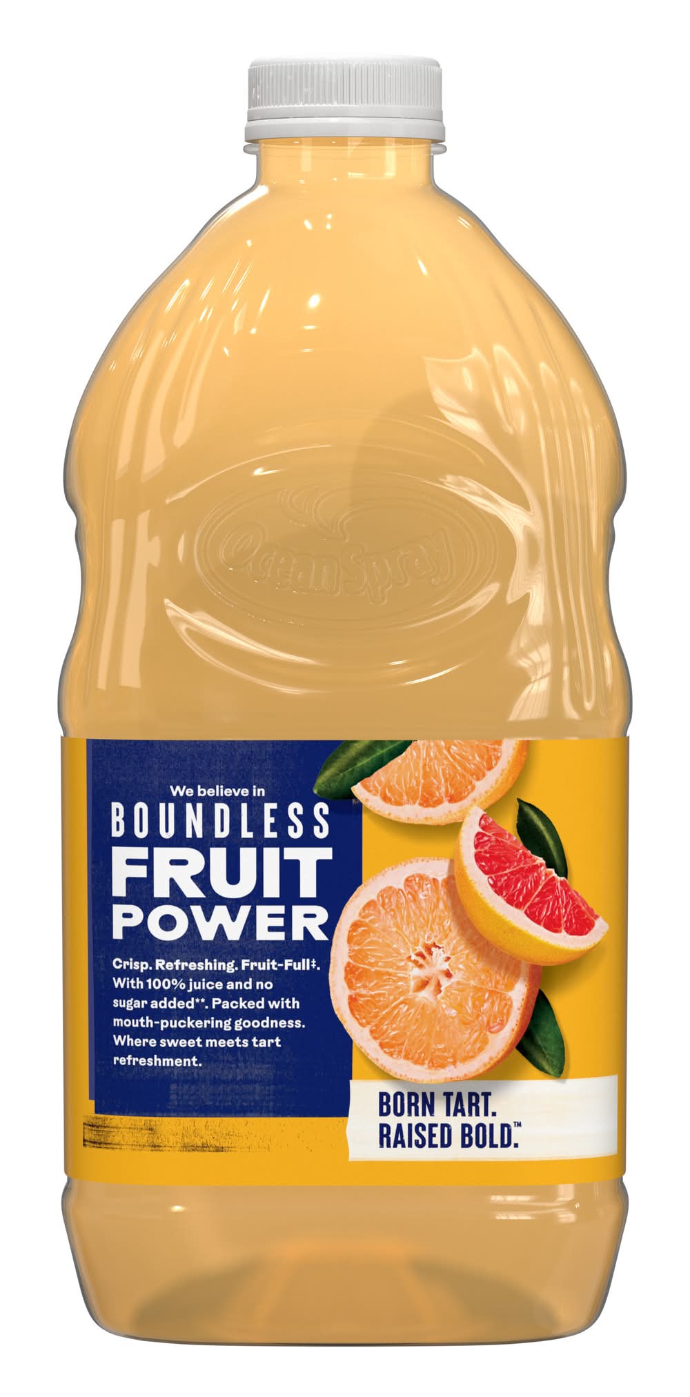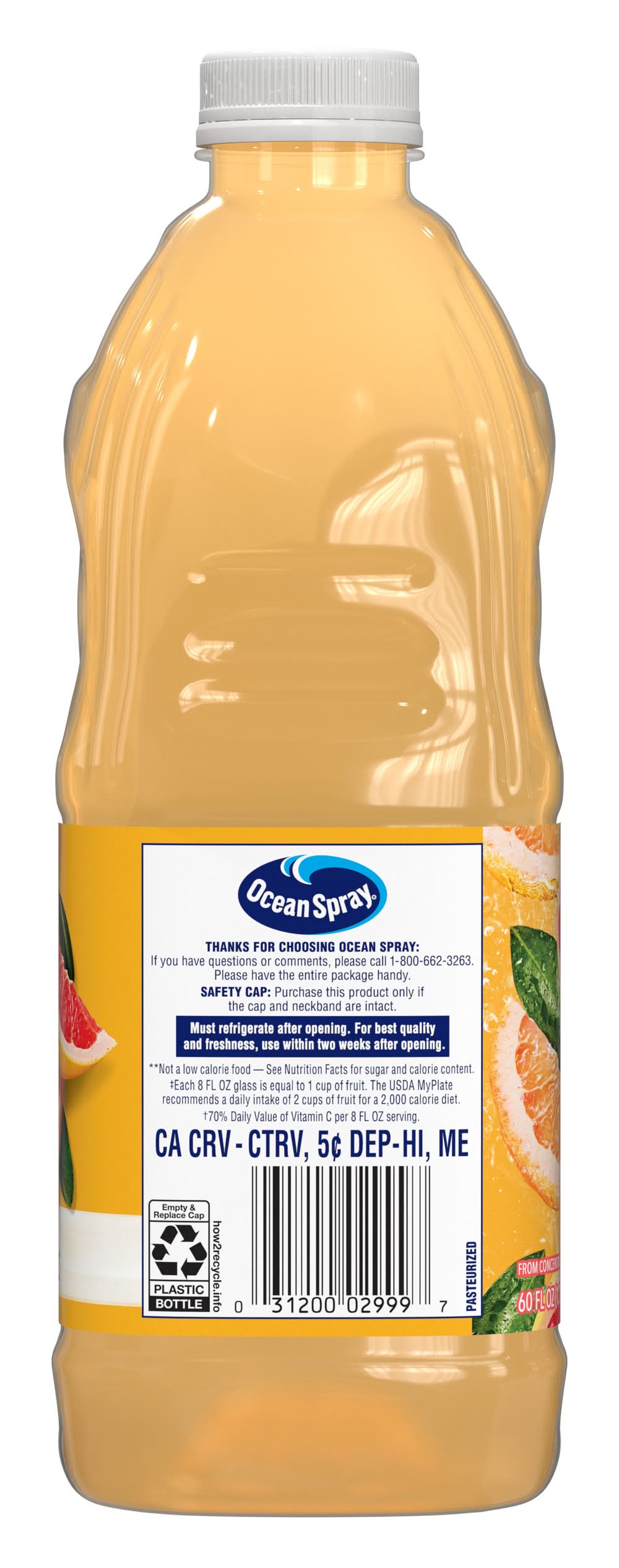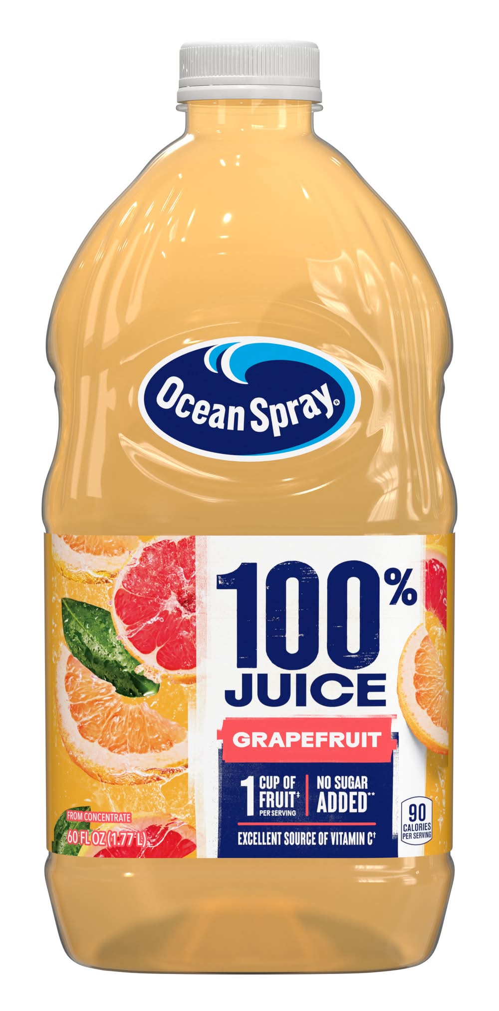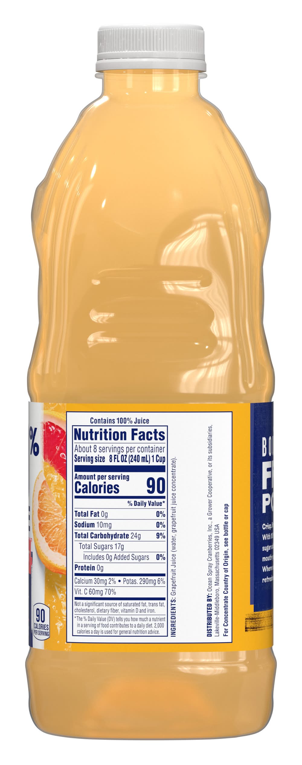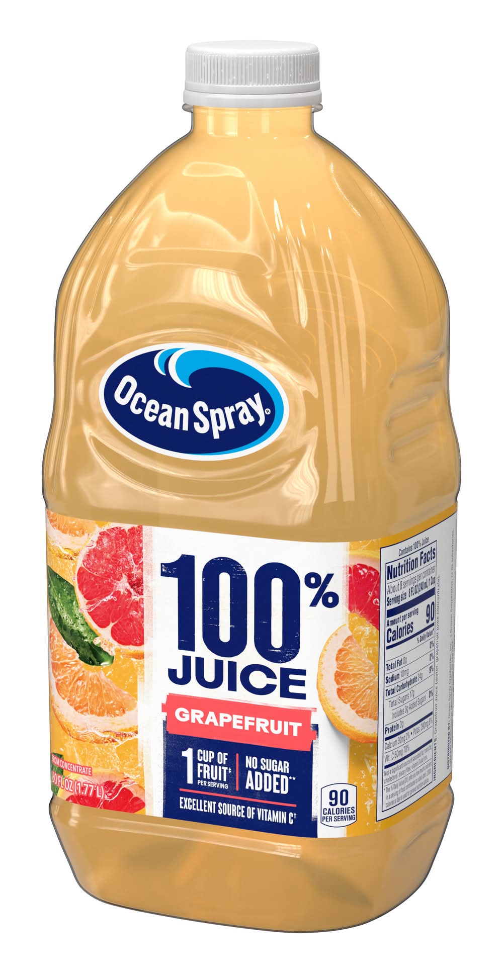 No sugar added. 90 calories per serving. From concentrate. We're blushing. Ever have someone make your day with an unexpected surprise? Did it make you blush? We have some news to do just that. Ocean Spray 100% Grapefruit juice is made with Ocean Spray Grapefruit, picked at their peak of ripeness. Due to a shortage of delicious, Indian River white grapefruit, Ocean Spray 100% Grapefruit Juice is now blushing with a naturally invigorating blend of both 100% white and 100% pink grapefruit juices. The best news of all, it still has the same great taste you've come to know and love! Enjoy all the benefits of our delicious 100% juice: no sugar added (not a low calorie food - see nutrition facts for sugar and calorie content); no preservatives; no artificial flavors; 2 servings (1 cup) of fruit (each 8oz glass is equal to 1 cup of fruit. The USDA MyPlate recommends a daily intake of 2 cups of fruit for a 2,000 calorie diet); 100% vitamin C. Thanks for Choosing Ocean Spray: For questions or comments please call 1-800-662-3263. M-F 9 am to 4 pm EST. Please have the entire package handy. Tastes good. Good for you! Pasteurized. Please recycle. Contains 100% juice. For concentrate country of origin, see bottle. • Flavor: Grapefruit • Packaging: Reusable