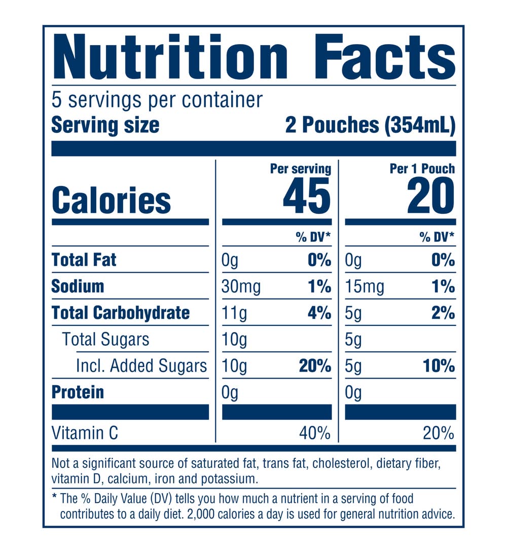 Drink Pouches deliver fun with a sweet blend of strawberry and orange flavors. Our delicious kids drink contains 75% less sugar than leading regular sodas , making it a great artificially fruit flavored drink for kids. Packed in a convenient drink pouch, kids can enjoy at home, on the beach or during lunchtime. • Flavor: Strawberry-orange punch • Pack size: 10 • Kraft Heinz Foods Company, Chicago, IL, 60601 • Packaging: Reusable