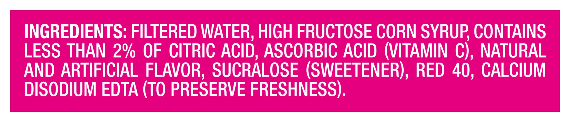 Ingredients: Filtered Water, High Fructose Corn Syrup, Contains Less than 2% of Citric Acid, Ascorbic Acid (Vitamin C), Natural and Artificial Flavor, Sucralose (Sweetener), Red 40, Calcium Disodium EDTA (to Preserve Freshness)