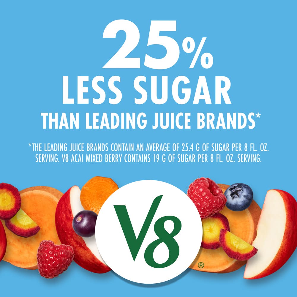 Experience a delicious plant-powered blend of vegetables and fruit with V8 Acai Mixed Berry 100% Fruit and Vegetable Juice. Combining the flavors of acai berries, blueberries and raspberries, this mixed berry juice gives you the nutrition of vegetables blended with just the right amount of fruit for a light, sweet taste. Each bottle of 100% juice is made with the juices of 3 pounds of fruits and vegetables, including apples, carrots, sweet potatoes, acai berries, raspberries and blueberries. The result is a vegetable and fruit juice blend with 25% less sugar than leading juice brands* and 2 combined servings of veggies and fruit in every 8 fl oz, plus Zinc and Antioxidants A and C. Formerly known as V8 V-Fusion, V8 100% Fruit and Vegetable Juice is gluten free and non-GMO with no sugar added.** Like the classic V8 juice, this fruit and vegetable drink is an easy way to get the plant based boost you need to help fuel your day. Enjoy it as a breakfast drink, afternoon snack, or post workout drink. (*Per 8 fl oz: Leading juice brands, 25.4g; V8 Acai Mixed Berry, 19g **Not a low calorie food; see nutrition panel for sugar and calorie content) Packaging: Reusable