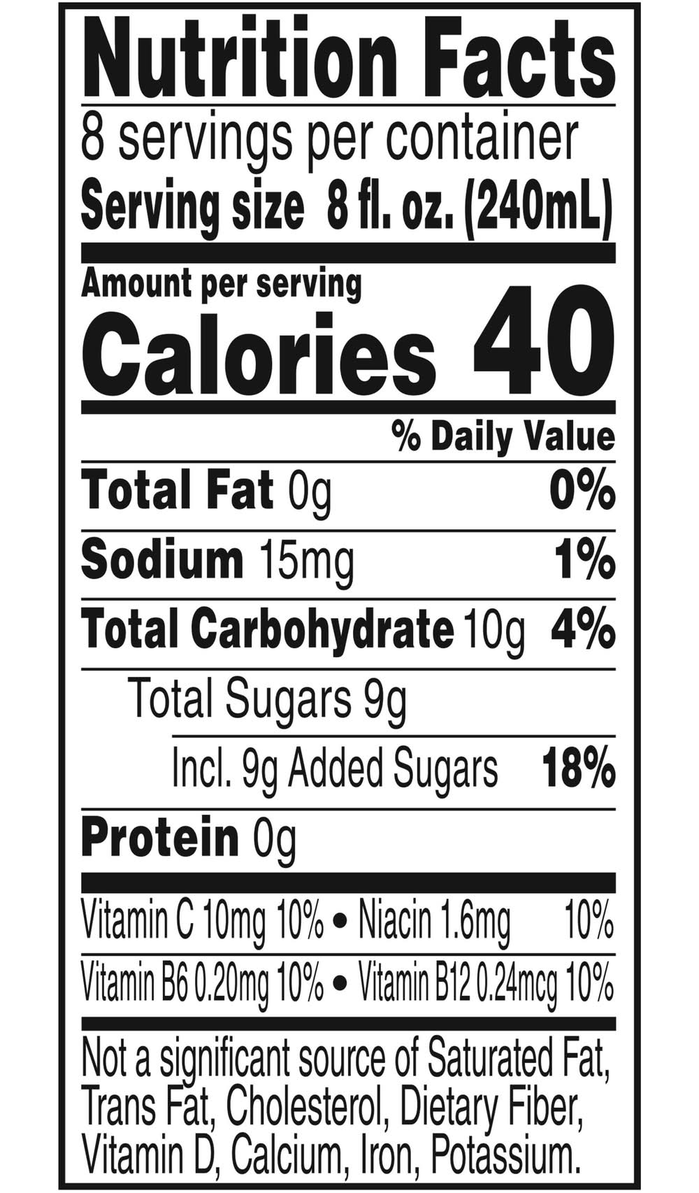 Ingredients: INGREDIENTS: WATER, CARROT JUICE CONCENTRATE, HIGH FRUCTOSE CORN SYRUP, CITRIC ACID, NATURAL FLAVORING, VITAMIN C (ASCORBIC ACID), SUCRALOSE, NIACINAMIDE (VITAMIN B3), LICORICE ROOT EXTRACT (FOR FLAVOR), PYRIDOXINE HYDROCHLORIDE (VITAMIN B6), CYANOCOBALAMIN (VITAMIN B12), .