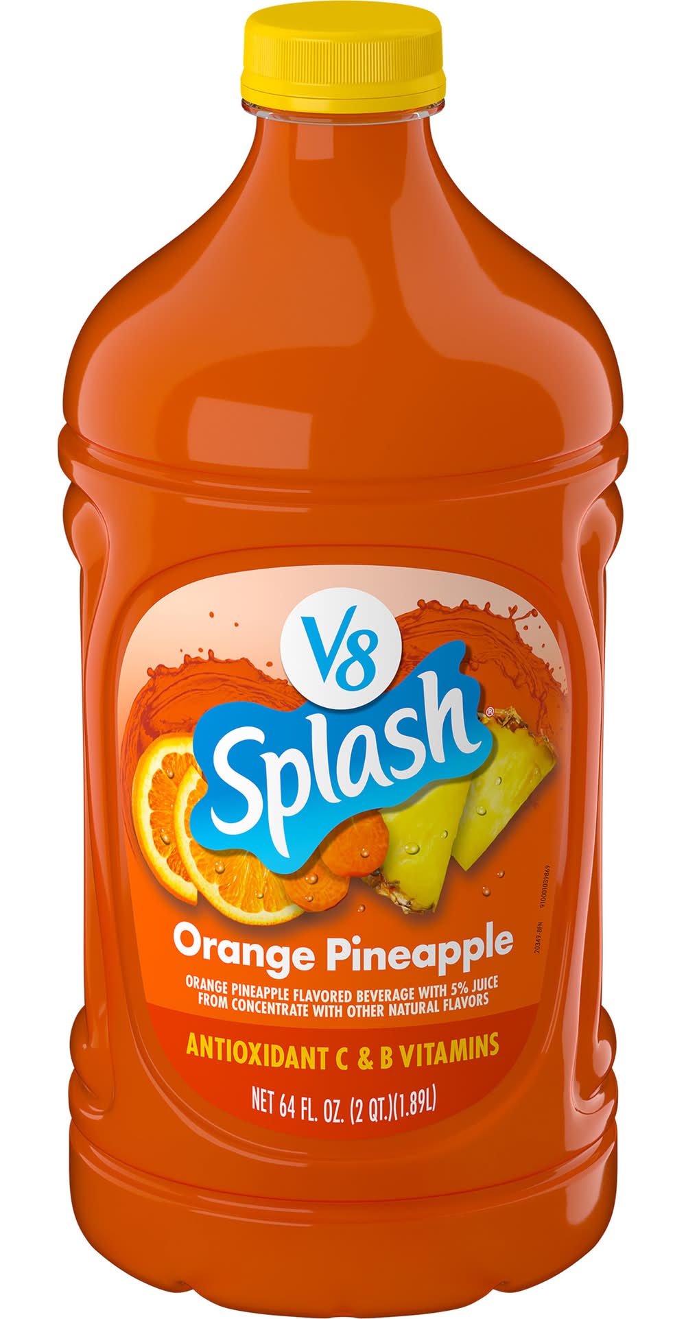 V8 Splash Orange Pineapple Flavored Beverage is a fruity burst of refreshment that the whole family can enjoy. Made with 5% juice, it's packed with tropical flavors like orange and pineapple for a taste that feels like summer in every sip. With antioxidant Vitamin C and B vitamins, this drink is more than delicious. Whether you're packing lunches for back-to-school or planning a sunny summer vacation, V8 Splash Orange Pineapple fits right in. Serve it at breakfast for a refreshing start to the day, or pour it over ice for a cool treat by the pool. Hosting a backyard barbecue? Add V8 Splash Orange Pineapple to your drink station for a splash of tropical fun. You can even mix it into smoothies for a fruity boost, or use it to create colorful mocktails that kids and adults will love. V8 Splash Orange Pineapple Flavored Beverage is a fruit juice beverage everyone can enjoy. Its vibrant tropical taste makes it perfect for everyday and special occasions. Whether you're enjoying it straight from the glass or adding it to creative drinks like smoothies or mocktails, it's sure to brighten your day. Packed with flavor and versatility, V8 Splash brings a little more fun to family time. • Campbell Soup Company, Camden, NJ 08103-1701 • Packaging: Reusable