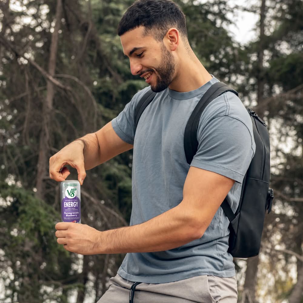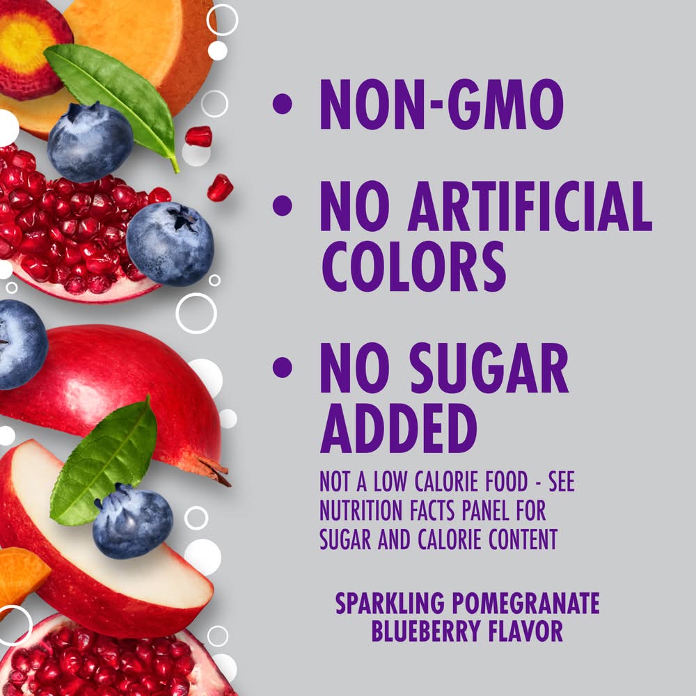 Experience a bubbly, plant-powered energy boost with V8 +Energy Sparkling Pomegranate Blueberry Juice Energy Drink. Combining the flavors of sweet pomegranate and juicy blueberry, this carbonated vegetable and fruit juice blend is infused with natural energy from black and green tea. Each 11.5 fl oz can contains 1 combined serving of veggies and fruit along with 80 milligrams of caffeine – as much as leading energy drink brands. A healthy energy drink alternative, V8 +Energy Pomegranate Blueberry Sparkling Juice contains 50 calories and 12 grams of carbs per can. It’s also an excellent source of B Vitamins. V8 +Energy sparkling juice drinks are non-GMO and gluten-free with no sugar added* and no artificial colors. Enjoy V8 +Energy carbonated juice as a coffee substitute in the morning, in place of soda during the afternoon, or as a mocktail or cocktail mixer in the evening. It’s great anytime you need a plant based boost of natural caffeine. (*Not a low calorie food; see nutrition panel for sugar and calorie content) Flavor: Pomegranate-blueberry