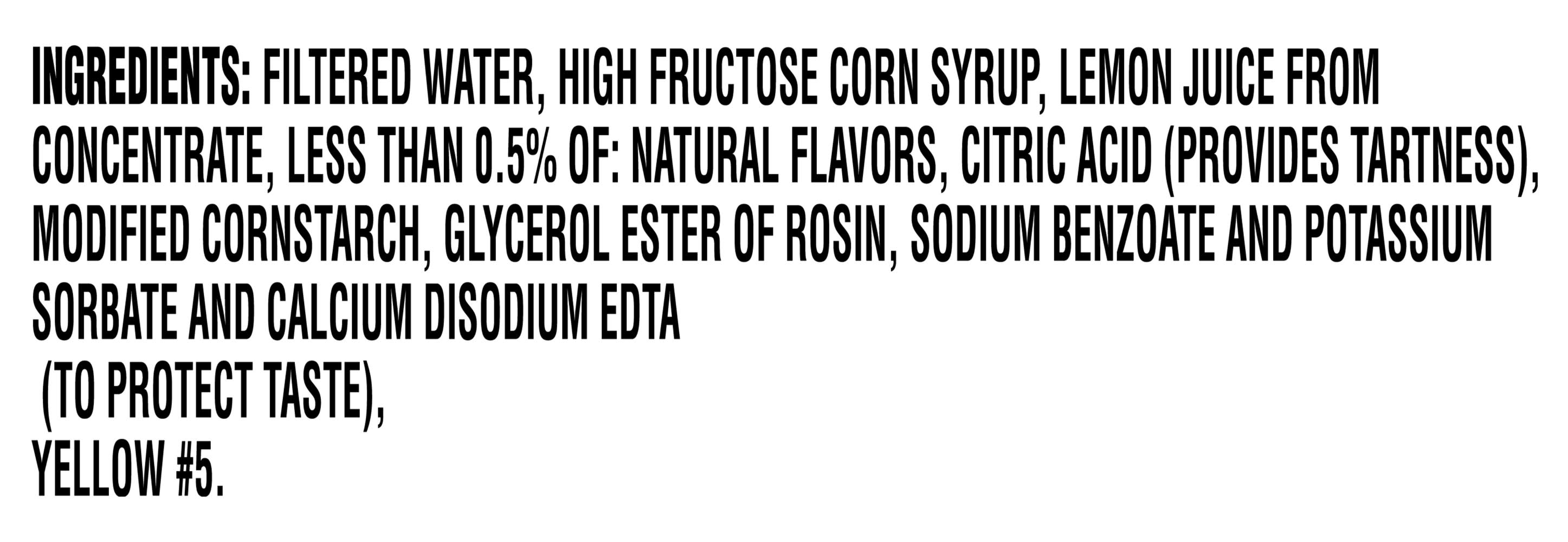 Ingredients: Pure Filtered Water, High Fructose Corn Syrup, Lemon Juice From Concentrate, Less Than 0.5% Of: Natural Flavors, Citric Acid (Provides Tartness), Modified Cornstarch, Glycerol Ester Of Rosin, Sodium Benzoate And Potassium Sorbate And Calcium Disodium Edta (To Protect Taste), Yellow #5. Contains: Corn