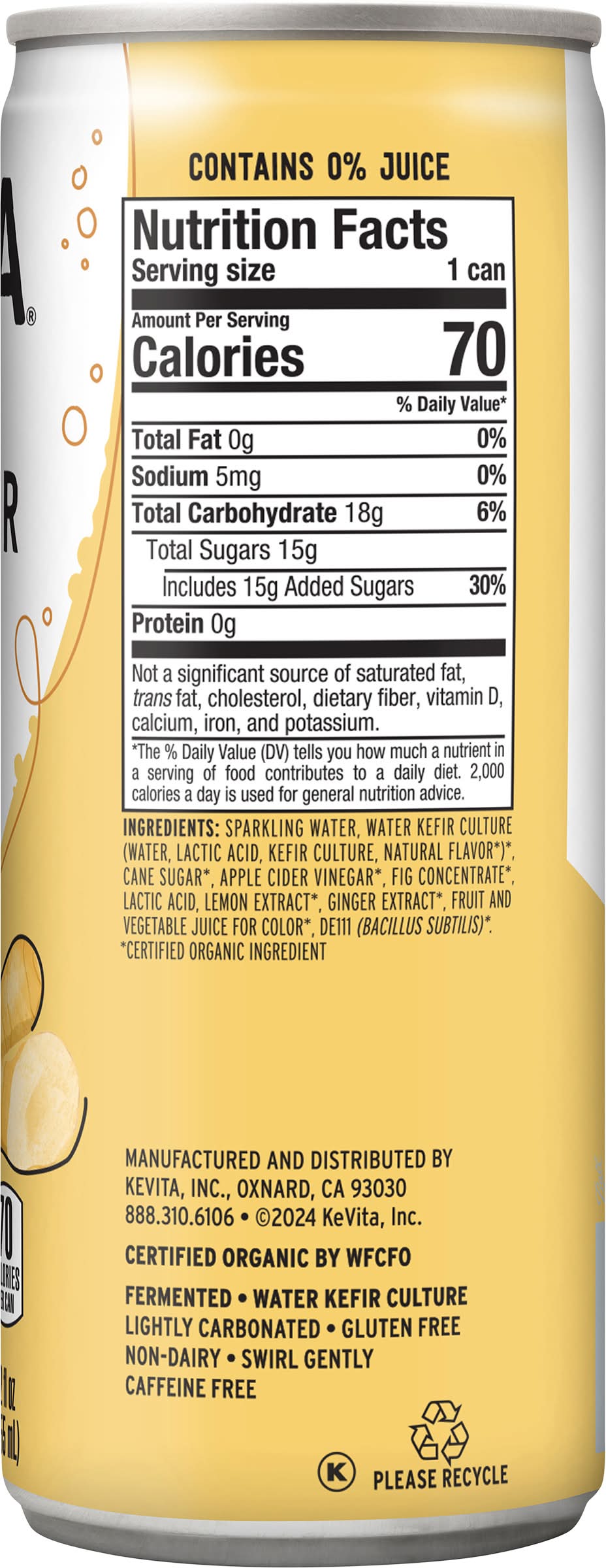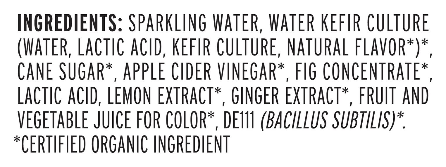 Ingredients: Sparkling Water, Water Kefir Culture (Water, Lactic Acid, Kefir Culture, Natural Flavor (Certified Organic Ingredient)) (Certified Organic Ingredient), Cane Sugar (Certified Organic Ingredient), Apple Cider Vinegar (Certified Organic Ingredient), Fig Concentrate (Certified Organic Ingredient), Lactic Acid, Lemon Extract (Certified Organic Ingredient), Ginger Extract (Certified Organic Ingredient), Fruit and Vegetable Juice for Color (Certified Organic Ingredient), DE111 (Bacillus Subtilis) (Certified Organic Ingredient)