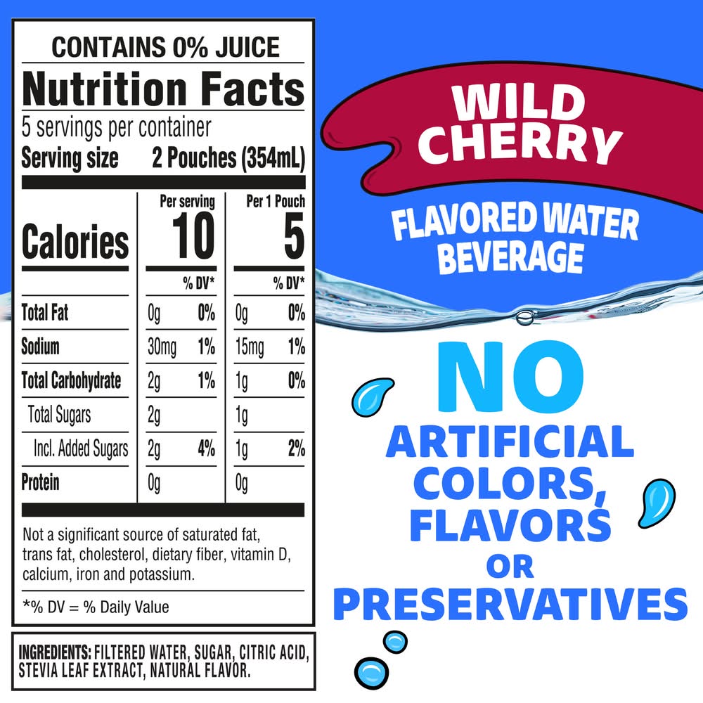 Take hydration to the next level with Capri Sun Roarin’ Waters Wild Cherry Flavored Water Beverage. Our new formula is sweetened with stevia and sugar. Wild Cherry features the bright essence of cherries. Always a kids' favorite, our flavored water is so tasty that even parents can't resist sneaking a pouch or two! Capri Sun Roarin’ Waters Wild Cherry comes in the iconic Capri Sun 6 fluid ounce pouch so it’s easy to help kids stay hydrated at school, on the playground or during practice. Every package contains 4 boxes, each with 10 convenient pouches of fruity flavored water. Capri Sun Roarin' Waters is sure to make kids ROAR! • Flavor: Wild cherry • Pack size: 10 • Kraft Heinz Foods Company, Chicago,IL,60601 • Packaging: Reusable