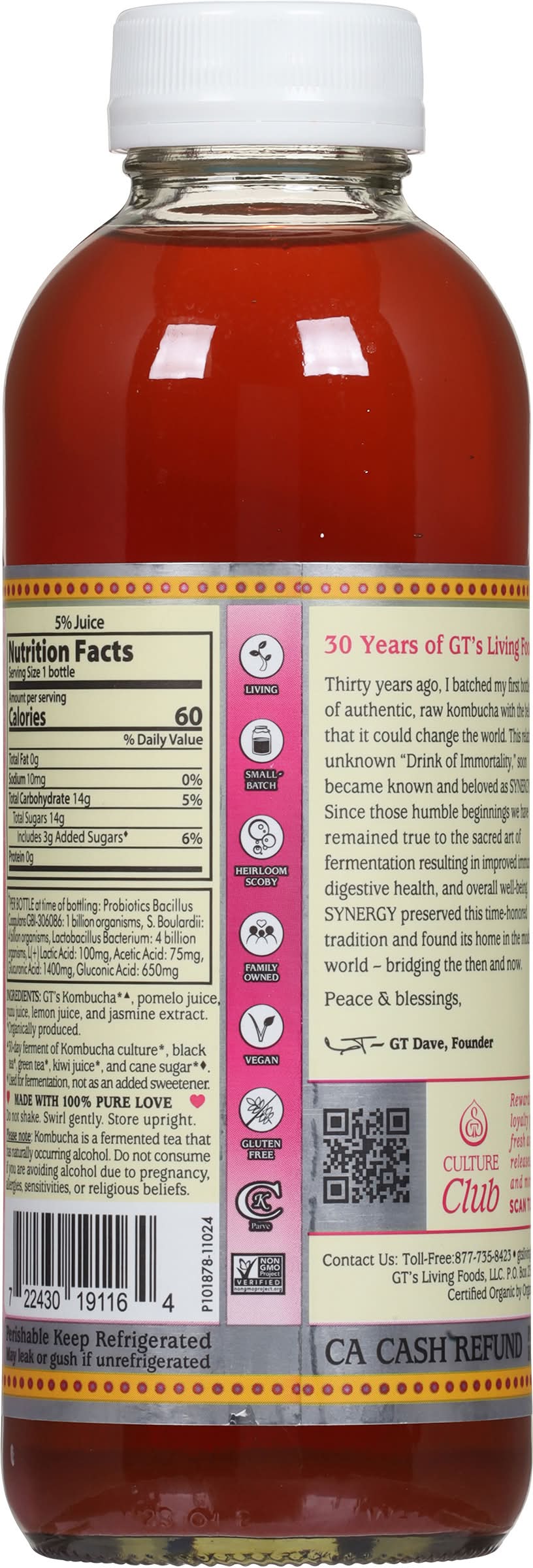 Ingredients: Gt's Kombucha*(a), Pomelo Juice, Yuzu Juice, Lemon Juice, and Jasmine Extract. (a) 30-Day Ferment of Kombucha Culture*, Black Tea*, Green Tea*, Kiwi Juice*, and Cane Sugar*(b). * Organically Produced. (b) Used for Fermentation, Not as an Added Sweetener
