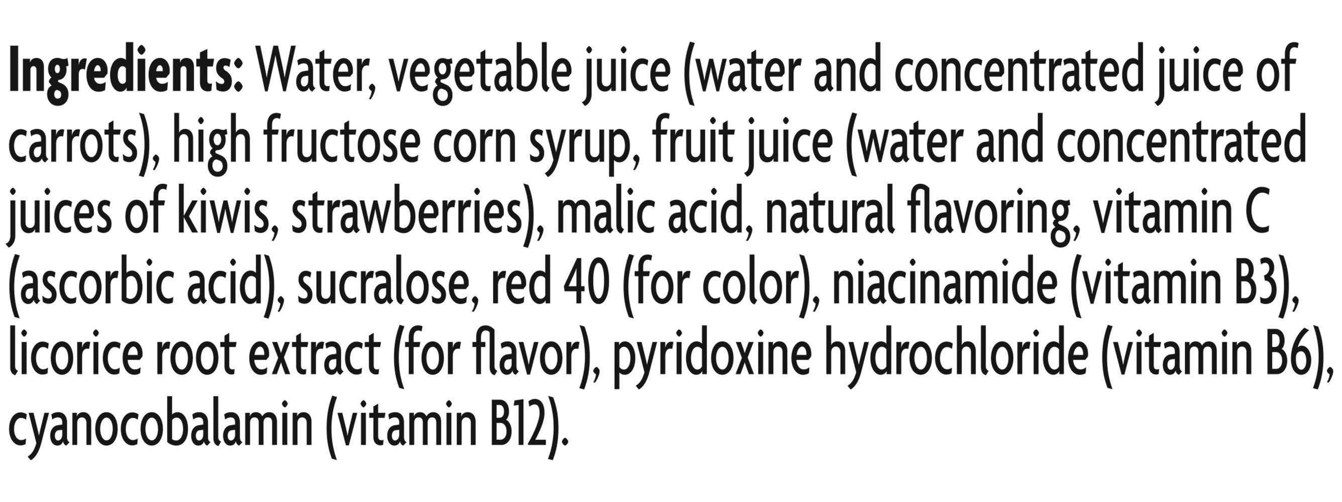 Ingredients: INGREDIENTS: WATER, VEGETABLE JUICE (WATER AND CONCENTRATED JUICE OF CARROTS), HIGH FRUCTOSE CORN SYRUP, FRUIT JUICE (WATER AND CONCENTRATED JUICES OF KIWIS, STRAWBERRIES), MALIC ACID, NATURAL FLAVORING, VITAMIN C (ASCORBIC ACID), SUCRALOSE, RED 40 (FOR COLOR), NIACINAMIDE (VITAMIN B3), LICORICE ROOT EXTRACT (FOR FLAVOR), PYRIDOXINE HYDROCHLORIDE (VITAMIN B6), CYANOCOBALAMIN (VITAMIN B12), . Contains: Corn