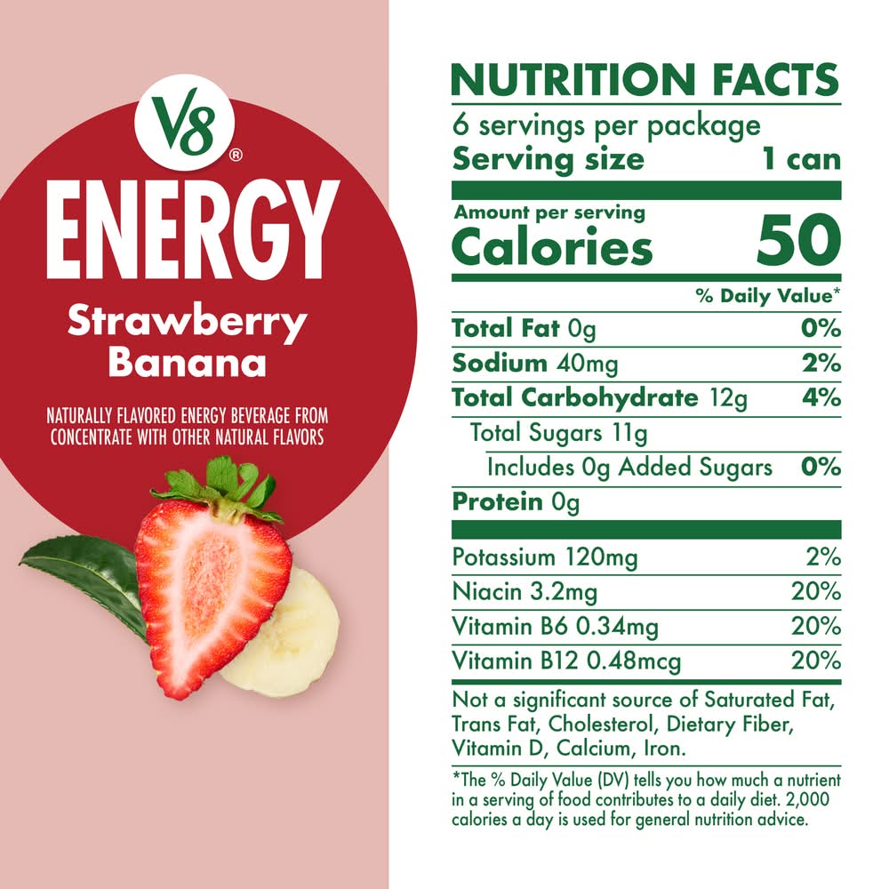 Steady energy from black & green tea. Naturally flavored plant-based energy beverage from concentrate with other natural flavors. 50 calories per can. Gluten free. • Flavor: Strawberry banana • Pack size: 6 • Campbell Soup Company, Camden,NJ,USA,08103-1701 • Packaging: Reusable
