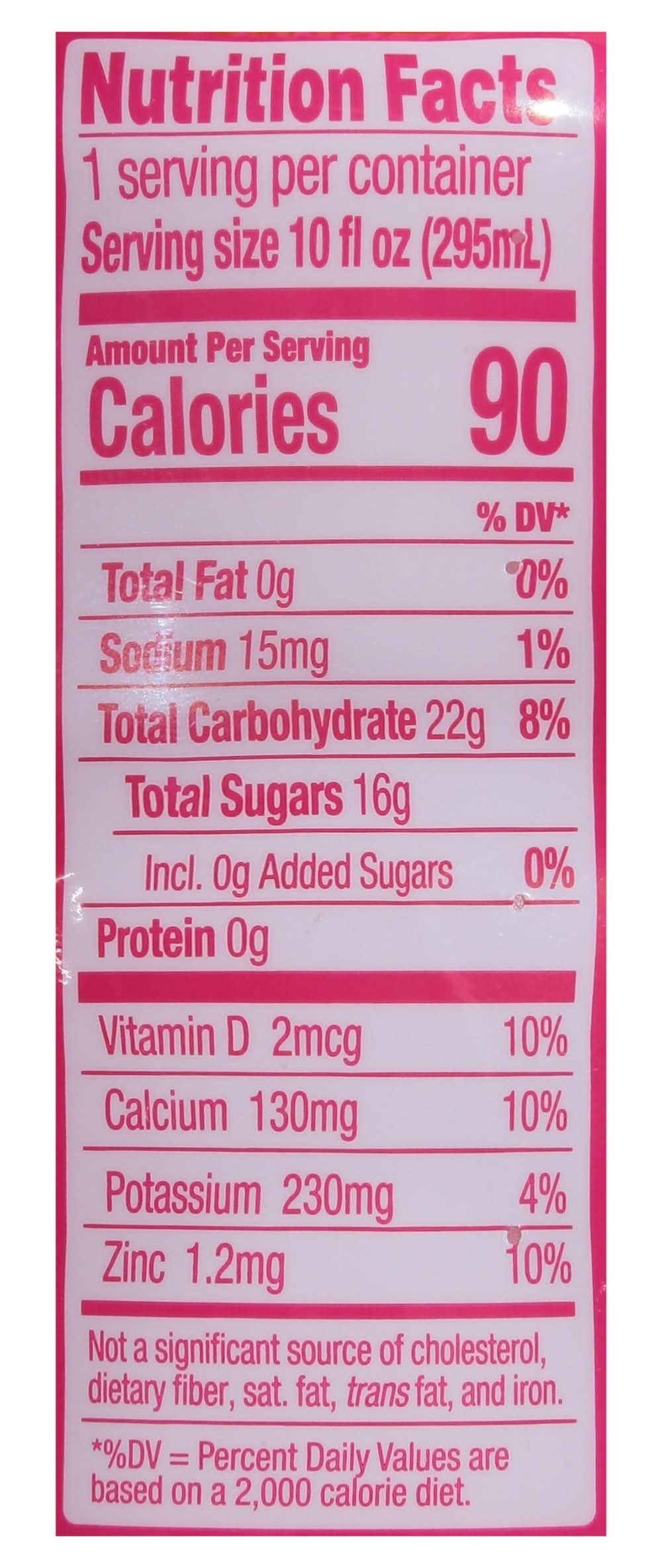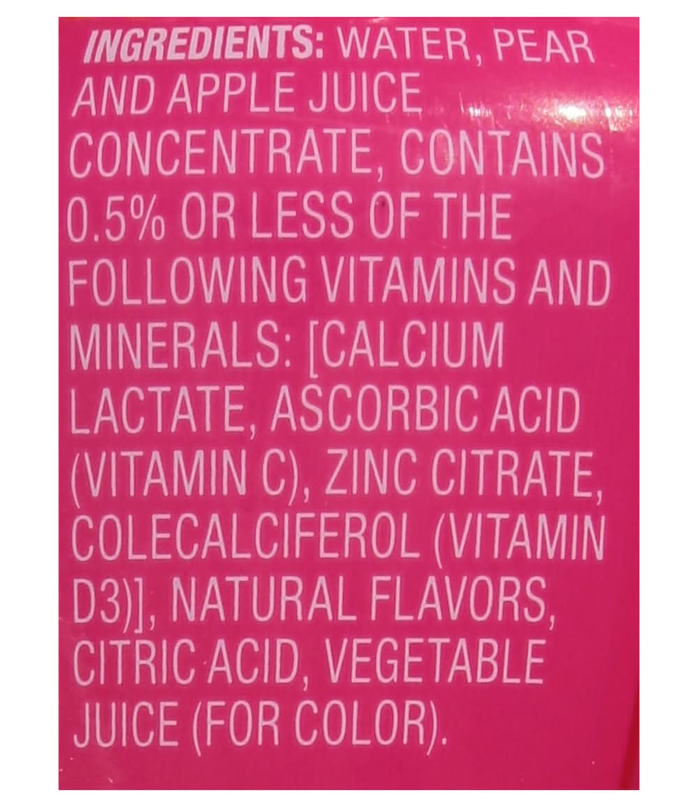 Ingredients: Water, Pear and Apple Juice Concentrate, Contains 0.5% or Less of the Following Vitamins and Minerals: [Calcium Lactate, Ascorbic Acid (Vitamin C), Zinc Citrate, Colecalciferol (Vitamin D3)], Natural Flavors, Citric Acid, Vegetable Juice (for Color)