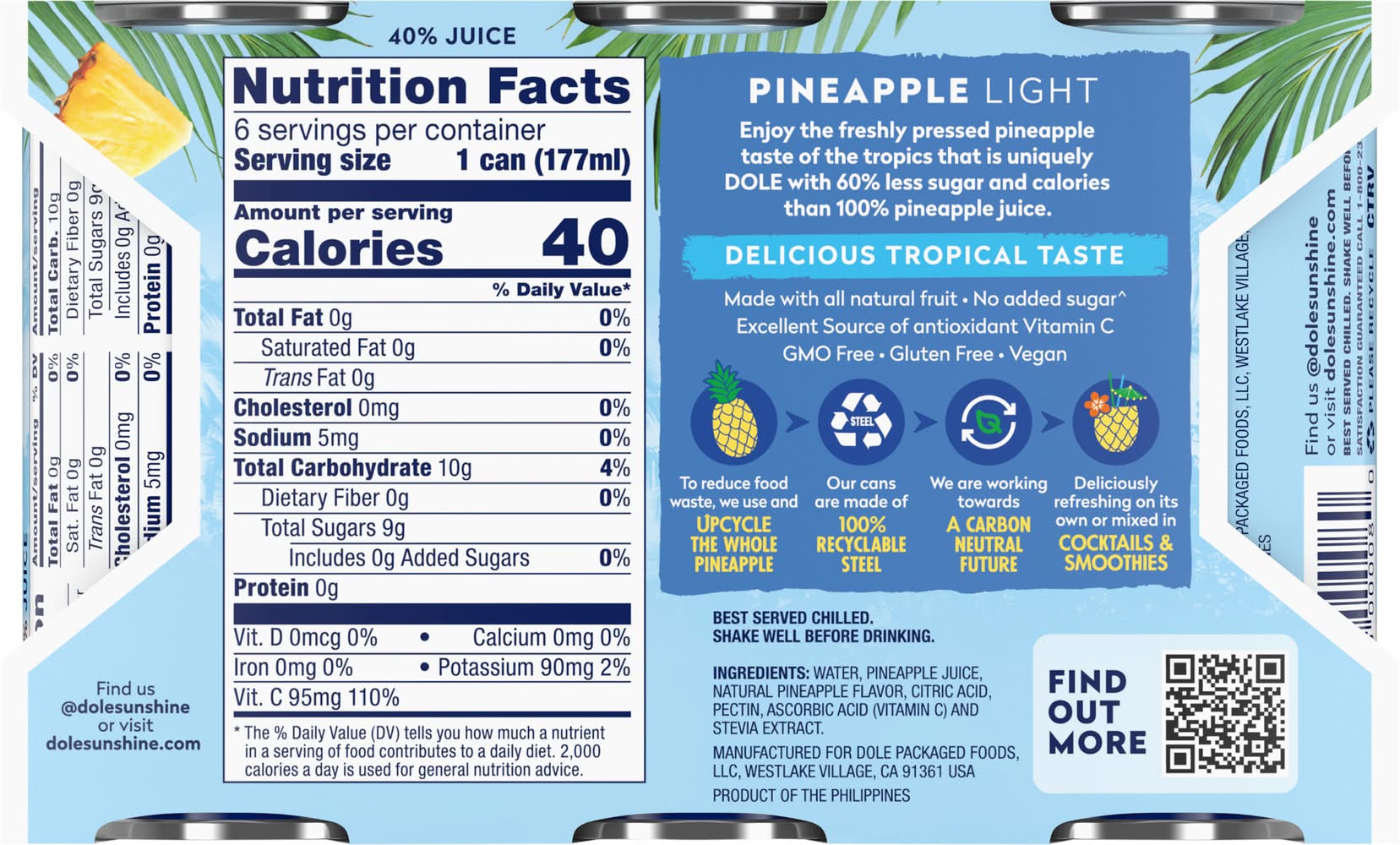 Dole Light Pineapple Juice Drink (6 x 6 fl oz)
