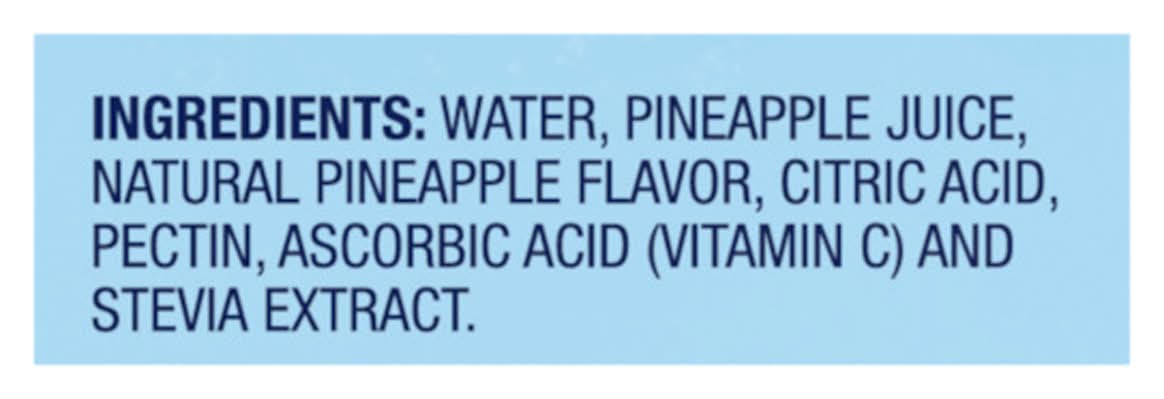 Ingredients: Water, Pineapple Juice, Natural Pineapple Flavor, Citric Acid, Pectin, Ascorbic Acid (Vitamin C) and Stevia Extract