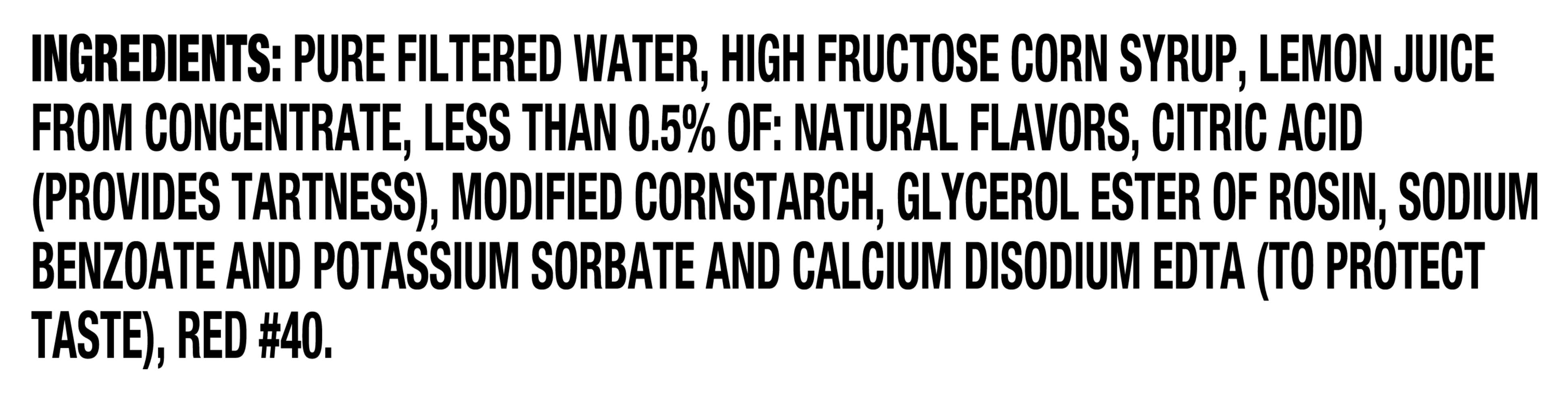 Ingredients: Pure Filtered Water, High Fructose Corn Syrup, Lemon Juice from Concentrate, Less than 0.5% of: Natural Flavors, Citric Acid (provides tartness), Modified Cornstarch, Glycerol Ester of Rosin, Sodium Benzoate and Potassium Sorbate and Calcium Disodium EDTA (to protect taste), Red #40