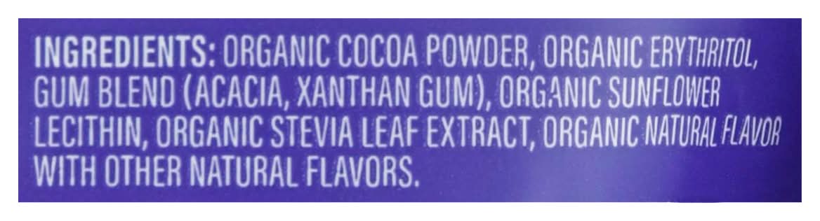 Ingredients: Organic Cocoa Powder, Organic Erythritol, Gum Blend (Acacia, Xanthan Gum), Organic Sunflower Lecithin, Organic Stevia Leaf Extract, Organic Natural Flavor with Other Natural Flavors
