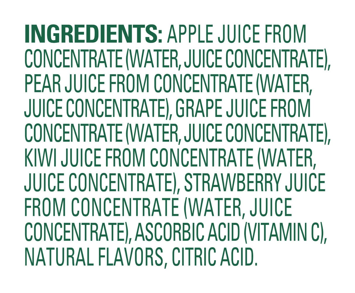Ingredients: Apple Juice from Concentrate (Water, Juice Concentrate), Pear Juice from Concentrate (Water, Juice Concentrate), Grape Juice from Concentrate (Water, Juice Concentrate), Kiwi Juice from Concentrate (Water, Juice Concentrate), Strawberry Juice from Concentrate (Water, Juice Concentrate), Ascorbic Acid (Vitamin C), Natural Flavors, Citric Acid.