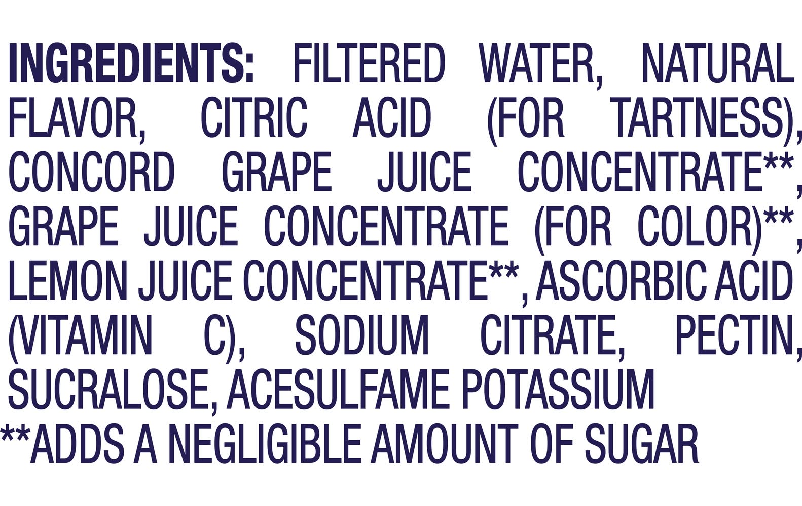 Ingredients: FILTERED WATER, NATURAL FLAVOR, CITRIC ACID (FOR TARTNESS), CONCORD GRAPE JUICE CONCENTRATE**, GRAPE JUICE CONCENTRATE (FOR COLOR)**, LEMON JUICE CONCENTRATE**, ASCORBIC ACID (VITAMIN C), SODIUM CITRATE, PECTIN, SUCRALOSE, ACESULFAME POTASSIUM **ADDS A NEGLIGIBLE AMOUNT OF SUGAR