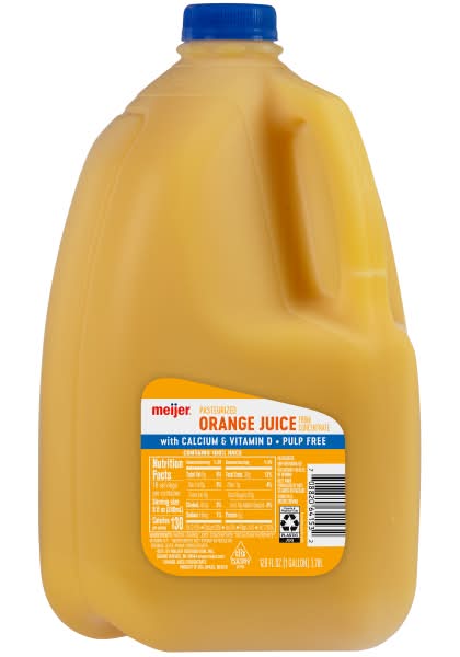 Meijer No Pulp Orange Juice is enriched with calcium and comes in a 3.78-liter container.