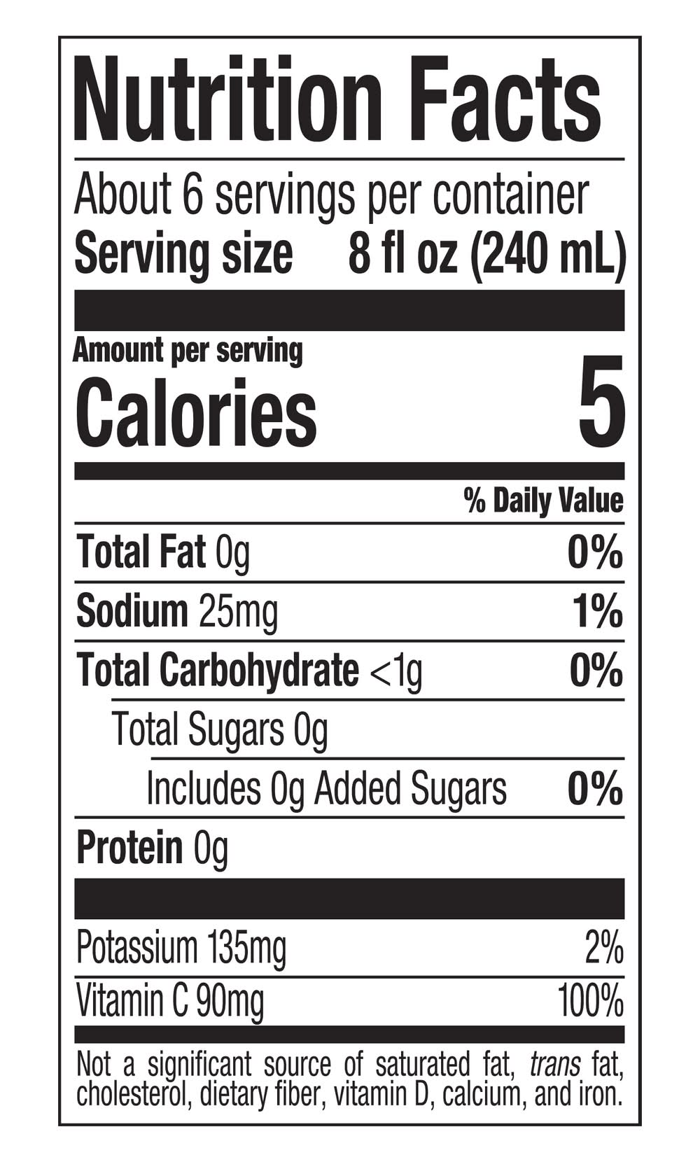 Flavored with other natural flavors. Drink with other natural flavors. 5 calories per 8 fl oz serving. Zero sugar. 100% DV of vitamin C. Low calorie. No artificial sweetener ingredients. Pasteurized. Packaging: Reusable