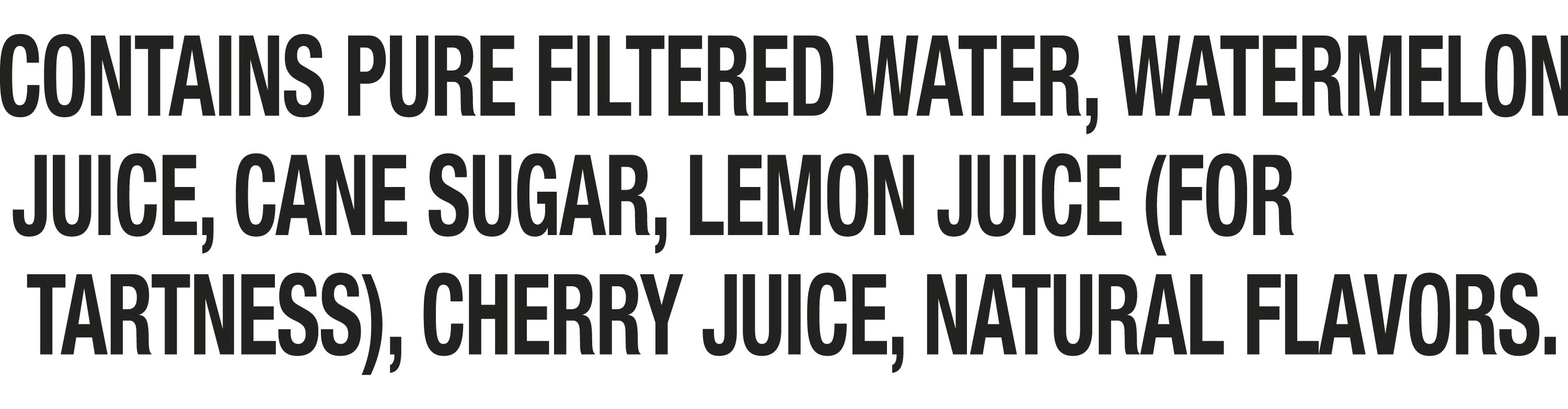 Ingredients: Pure Filtered Water, Watermelon Juice, Cane Sugar, Lemon Juice (for Tartness), Cherry Juice Natural Flavors