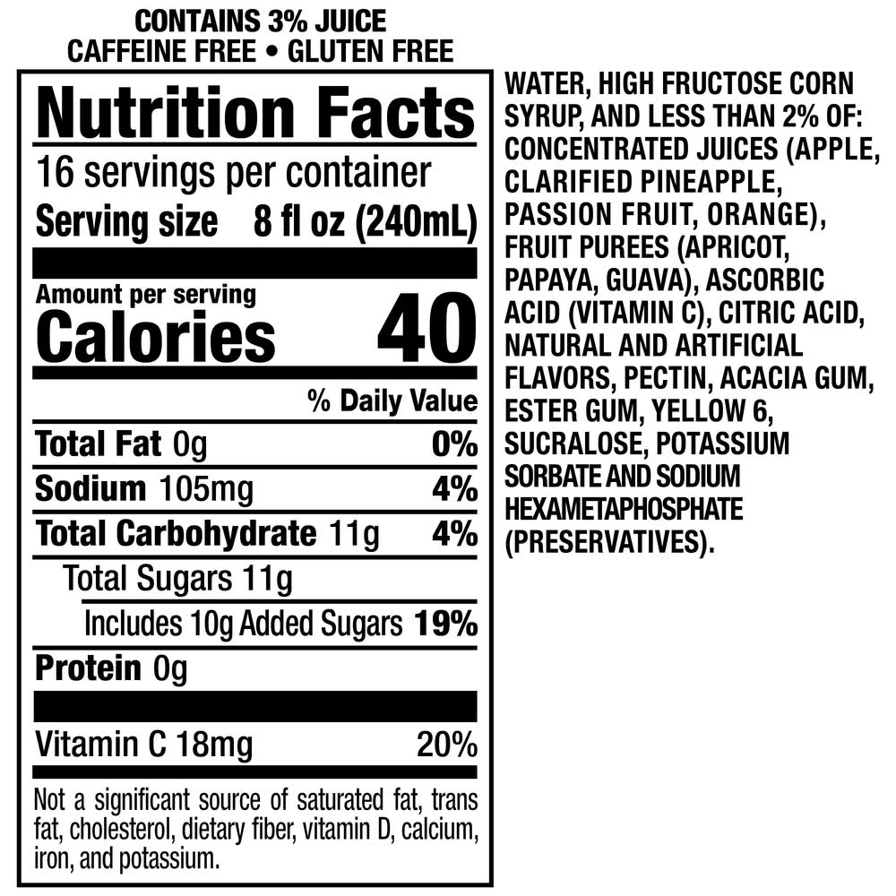 Ingredients: Water, High Fructose Corn Syrup, and Less than 2% of: Concentrated Juices Apple, Clarified Pineapple, Passionfruit, Orange, Fruit Purees Apricot, Papaya, Guava, Ascorbic Acid Vitamin C, Citric Acid, Natural and Artificial Flavors, Pectin, Acacia Gum, Ester Gum, Yellow 6, Sucralose, Potassium Sorbate and Sodium Hexametaphosphate Preservatives. Contains: Corn
