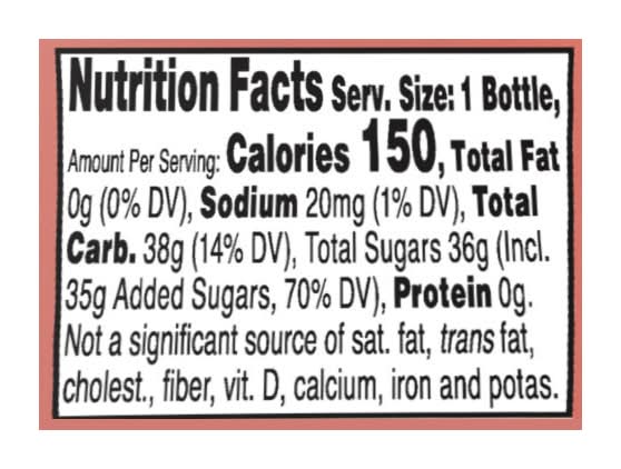150 calories per bottle. Very low sodium. Ingredients in this beverage are not Genetically Engineered. Not from concentrate. All natural. Delicious taste. Pasteurized. • Flavor: Lemon raspberry • Packaging: Reusable