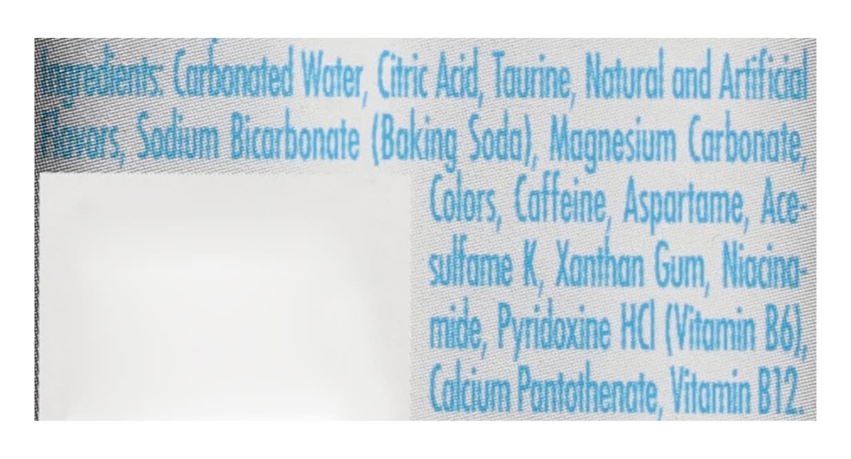 Ingredients: Carbonated Water, Citric Acid, Tourine, Natural and Artificial Flavors, Sodium Bicarbonate (Baking Soda), Magnesium Carbonate, Colors, Caffeine, Aspartame, Acesulfame K, Xanthan Gum, Niacinamide, Pyridoxine HCl (Vitamin B6), Calcium Pantothenate, Vitamin B12